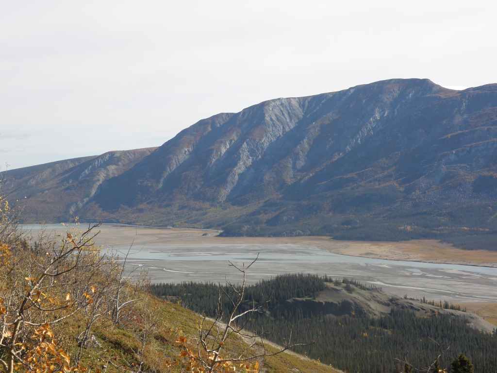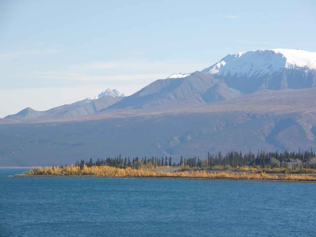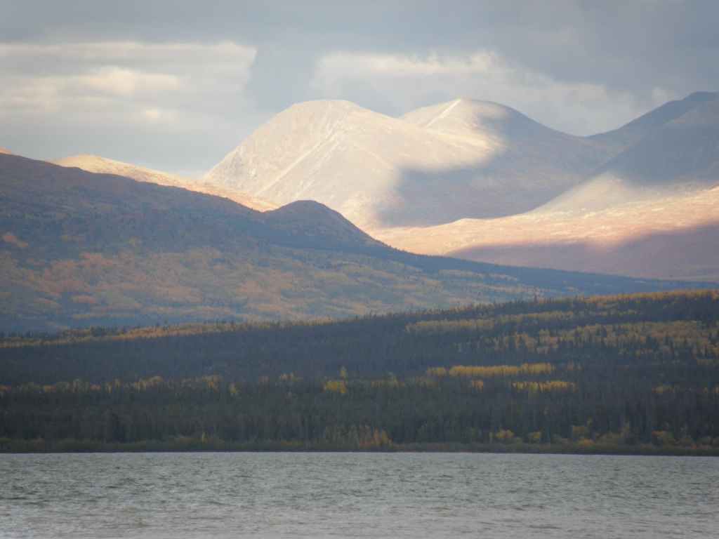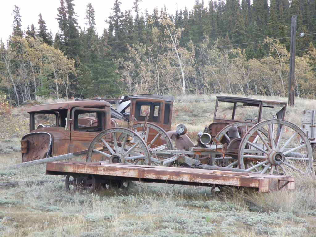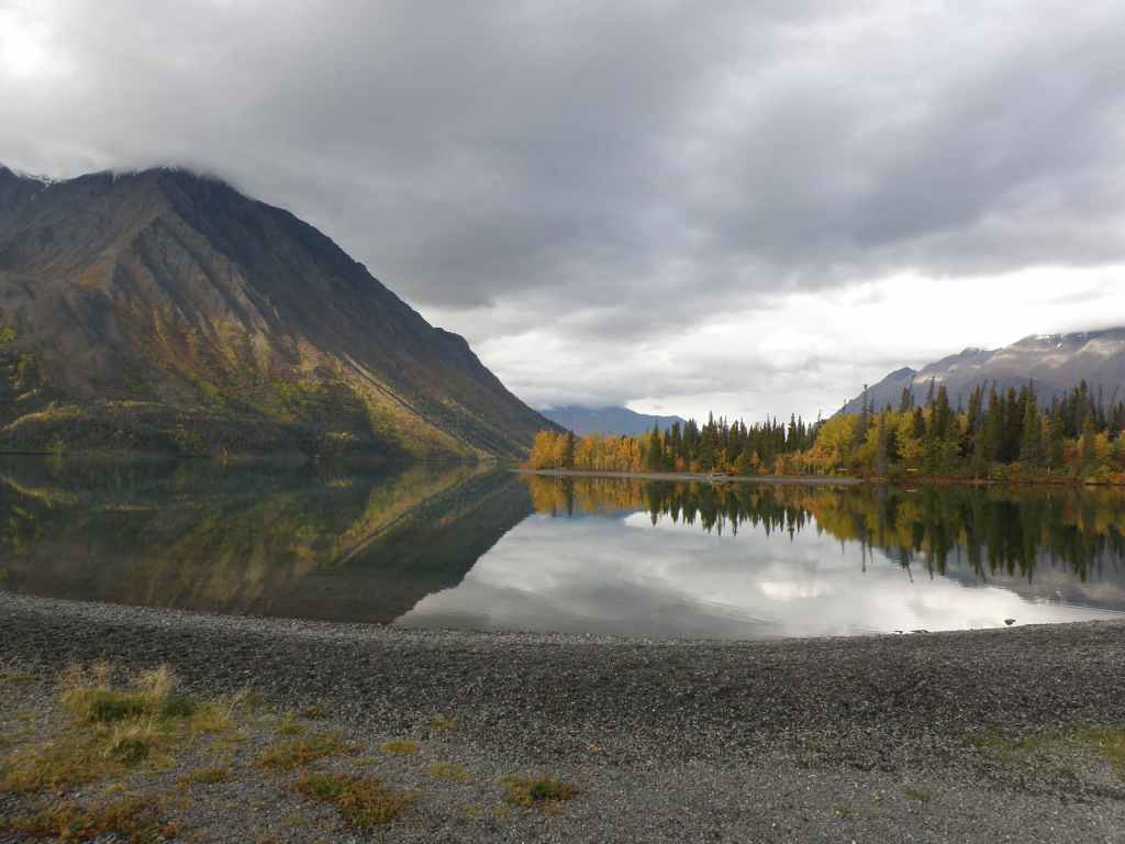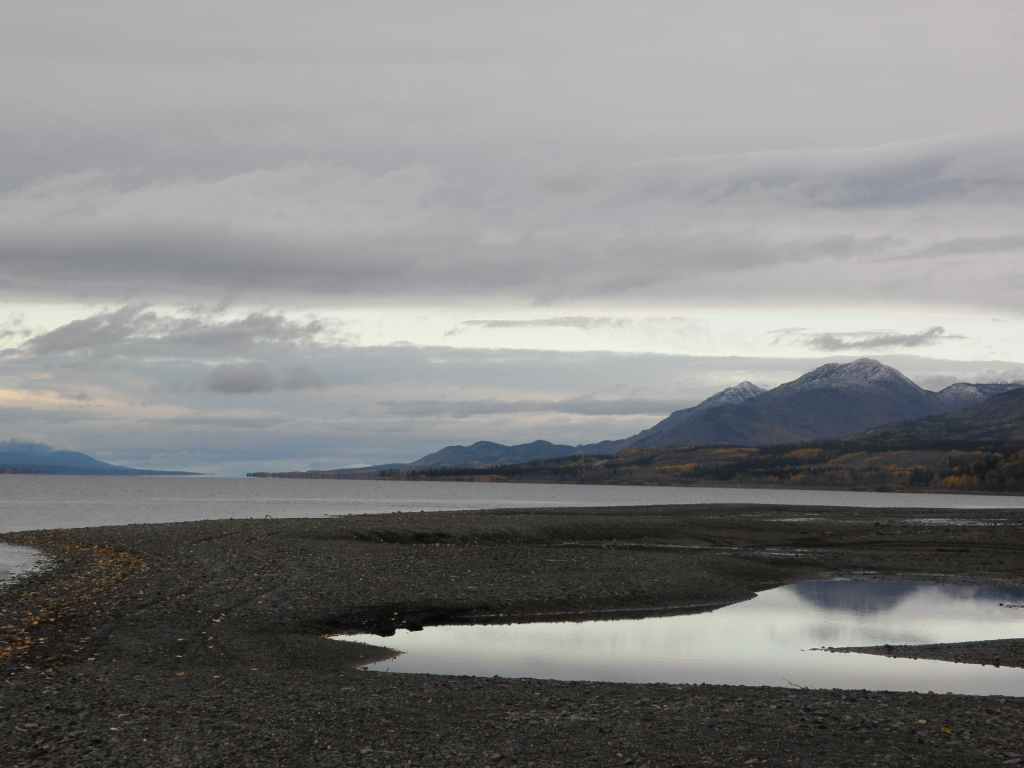 Les rayons du soleil embrasent le Yukon qui coule à côté de nous. 0°c ce matin et 5 cm de neige ! Mais elle disparait petit à petit au fil de la route et la température remonte à 7°C quand nous arrivons à Faro au terme de notre étape. Ici tout est fermé : la station d’essence a disparu ce qui risque de nous poser de sérieux problèmes pour continuer le lendemain. Après renseignement auprès de la police montée royale du village, nous trouvons quand même une petite épicerie ouverte le dimanche où l’on se ravitaille mais c’est le strict minimum…