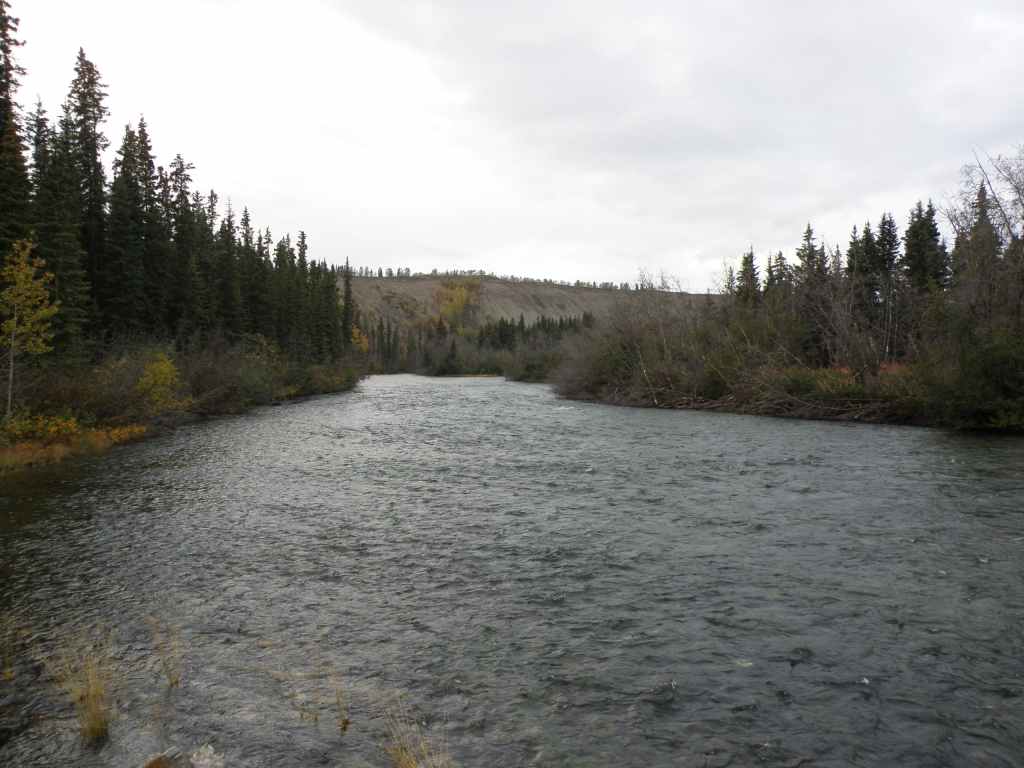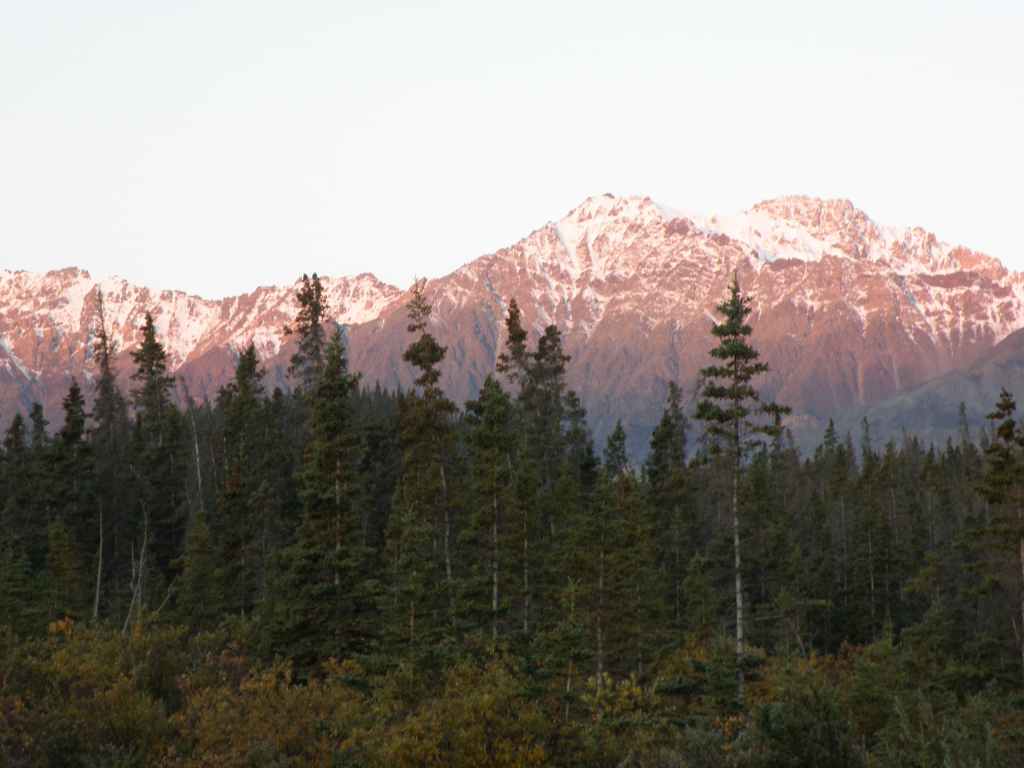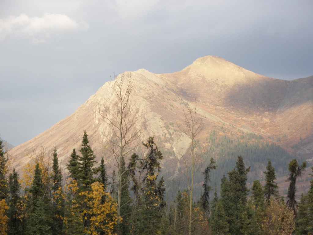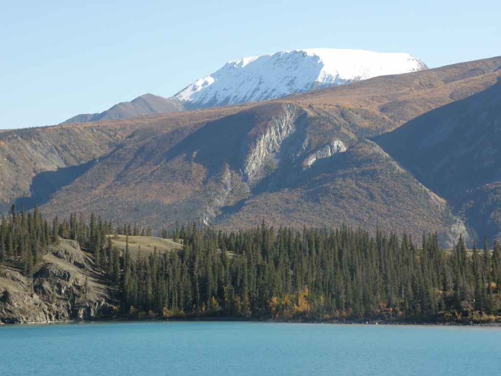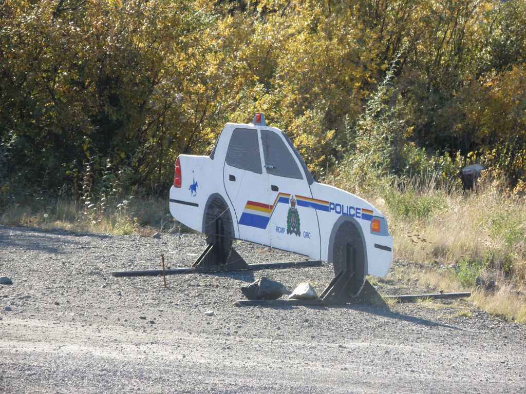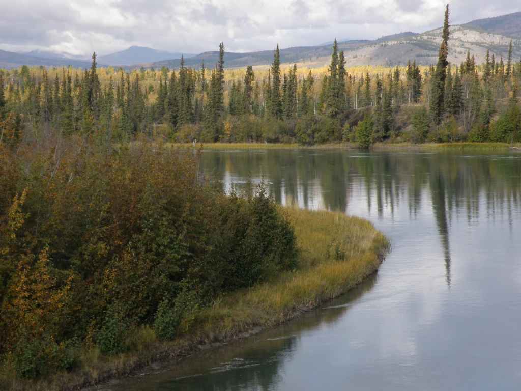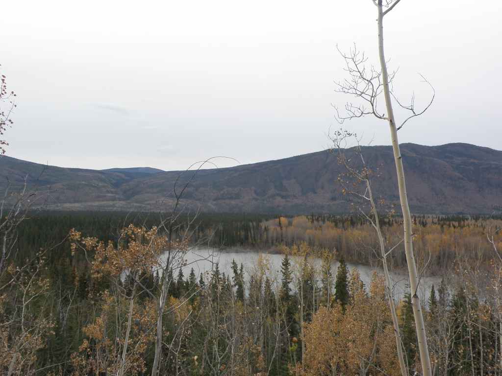 Les rayons du soleil embrasent le Yukon qui coule à côté de nous. 0°c ce matin et 5 cm de neige ! Mais elle disparait petit à petit au fil de la route et la température remonte à 7°C quand nous arrivons à Faro au terme de notre étape. Ici tout est fermé : la station d’essence a disparu ce qui risque de nous poser de sérieux problèmes pour continuer le lendemain. Après renseignement auprès de la police montée royale du village, nous trouvons quand même une petite épicerie ouverte le dimanche où l’on se ravitaille mais c’est le strict minimum…