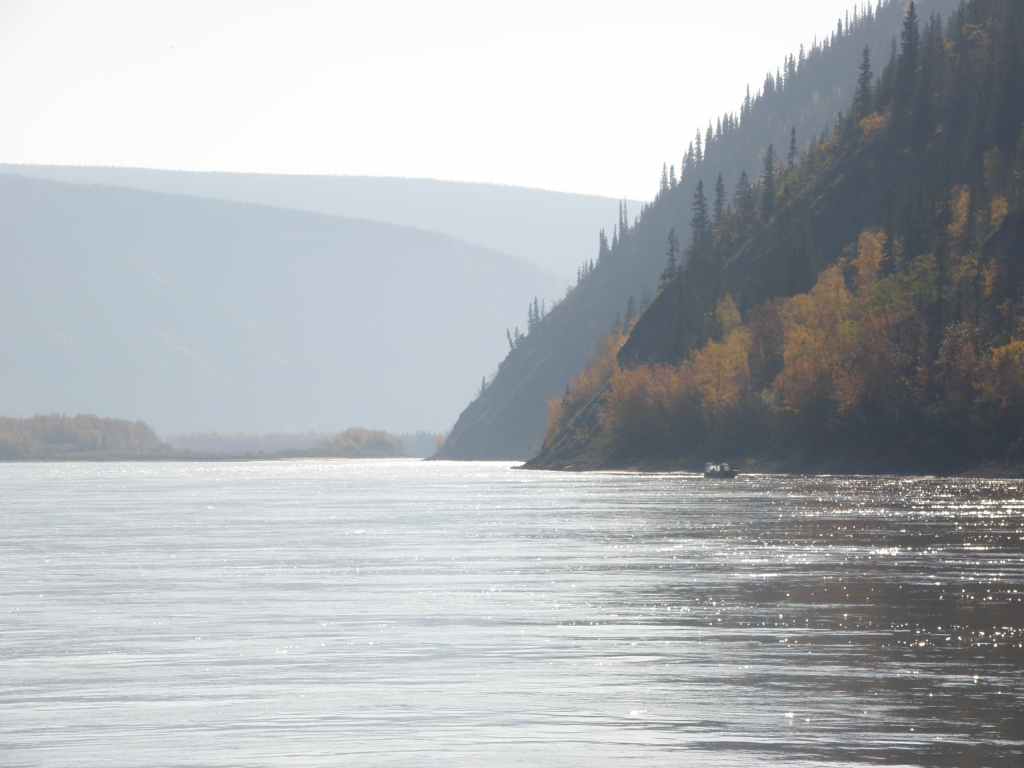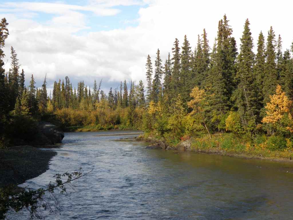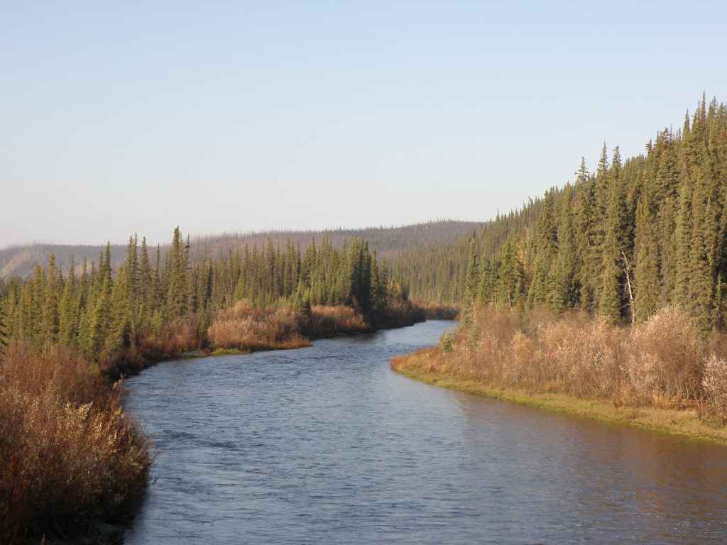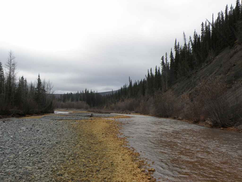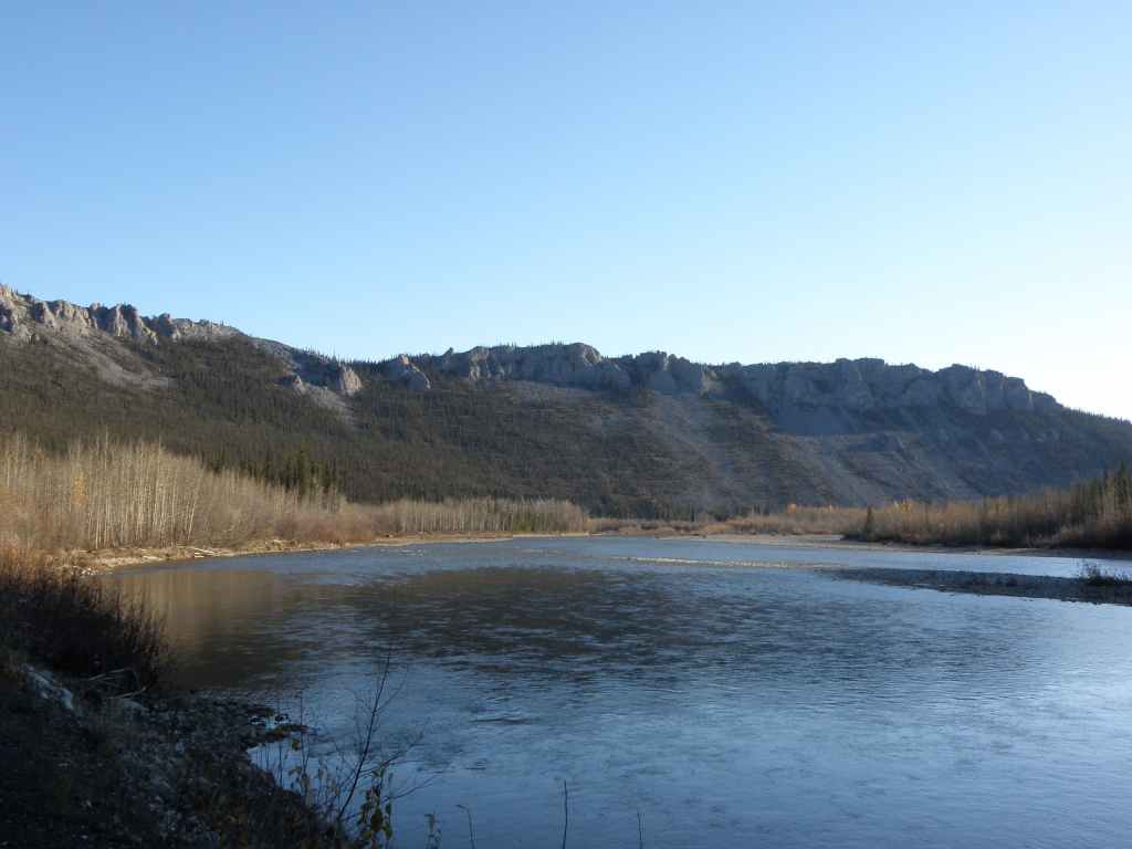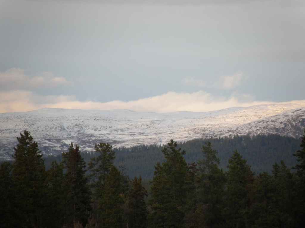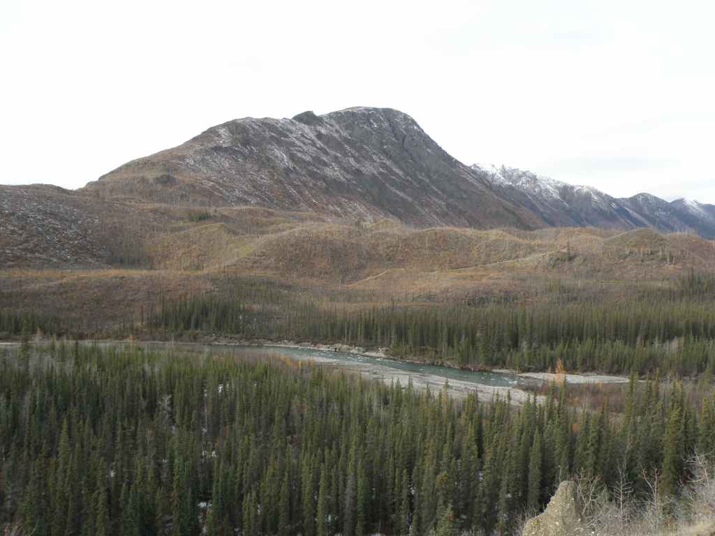 Les rayons du soleil embrasent le Yukon qui coule à côté de nous. 0°c ce matin et 5 cm de neige ! Mais elle disparait petit à petit au fil de la route et la température remonte à 7°C quand nous arrivons à Faro au terme de notre étape. Ici tout est fermé : la station d’essence a disparu ce qui risque de nous poser de sérieux problèmes pour continuer le lendemain. Après renseignement auprès de la police montée royale du village, nous trouvons quand même une petite épicerie ouverte le dimanche où l’on se ravitaille mais c’est le strict minimum…