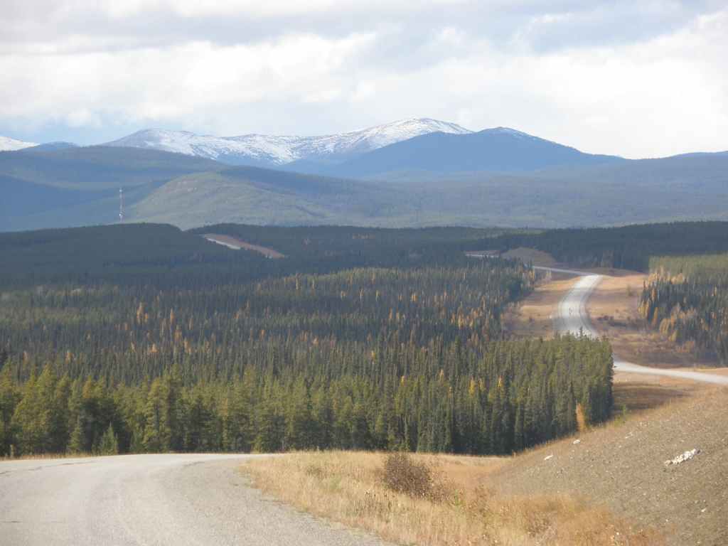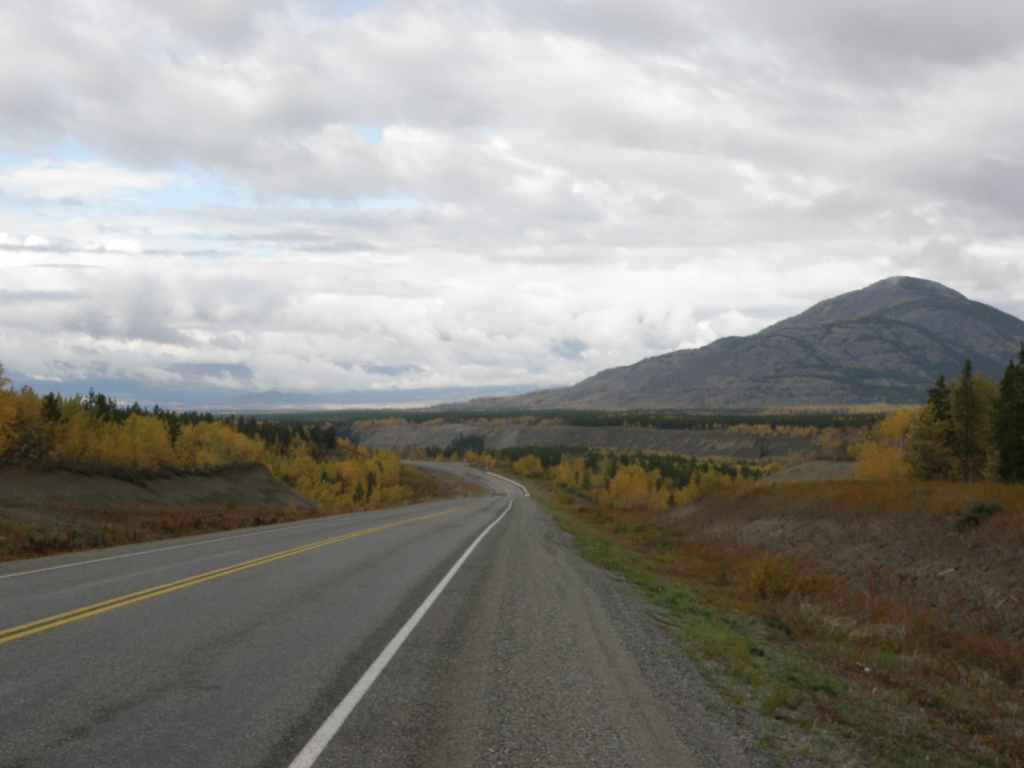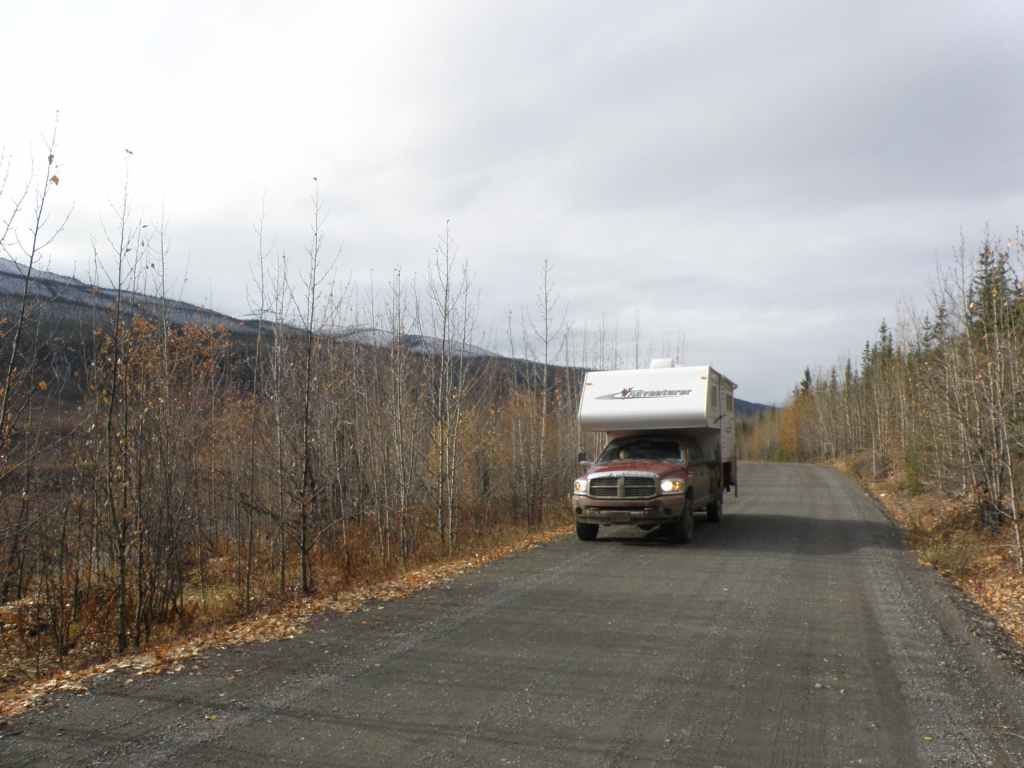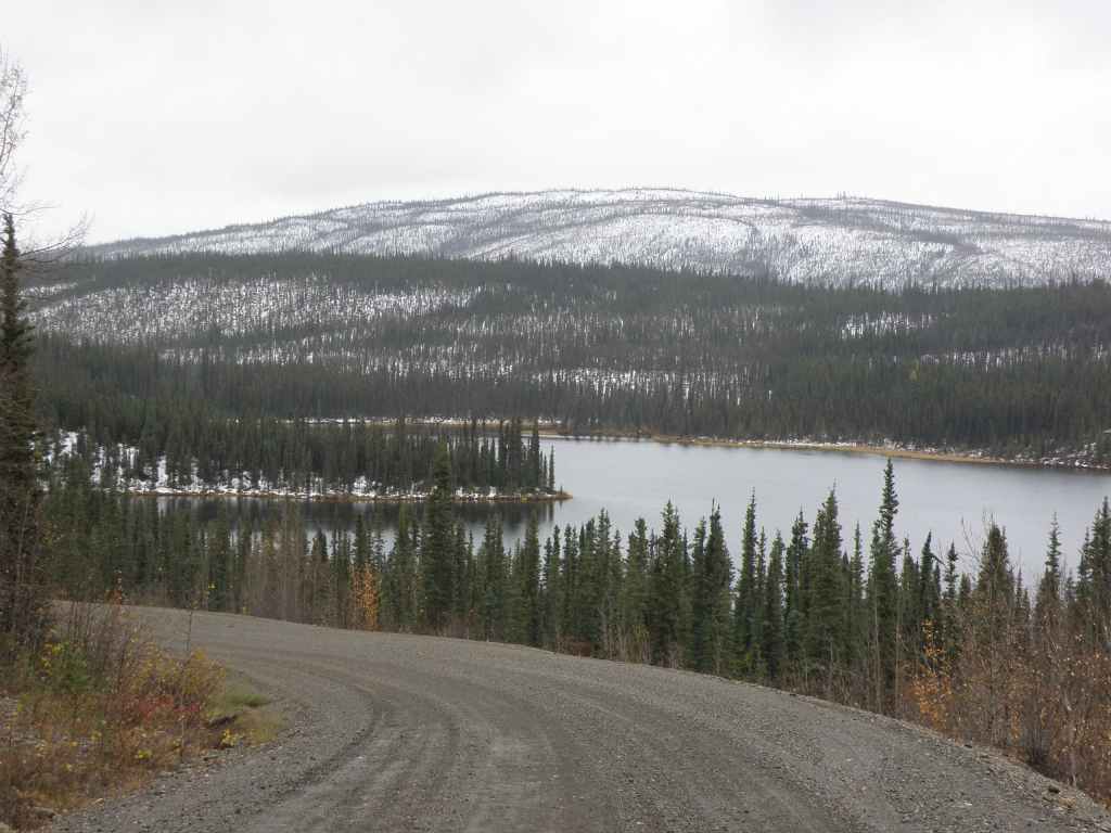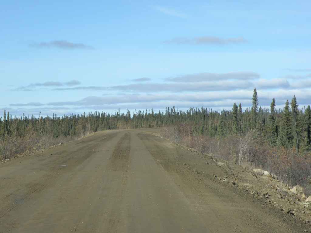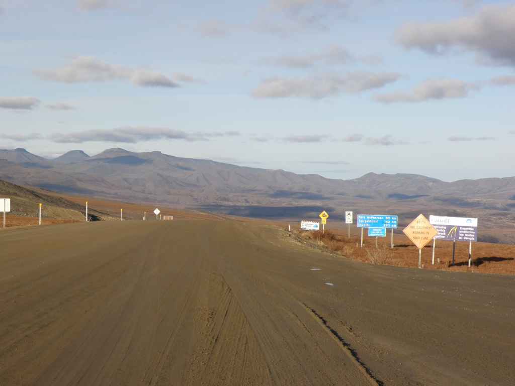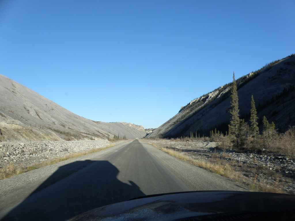 Plus que 20 puis 10 km… on avance toujours et enfin la pancarte du village, mais il nous faut trouver la station… ça y est, on y est !!! On remplit le réservoir avec 130 litres de GO. On peut donc repartir tranquille mais dans quelle direction ? On hésite… le chemin prévu et le plus court passe par la Canol Highway mais celle-ci n’est plus entretenue pour la saison par les services de l’Etat. Elle passe par la montagne et peut être enneigée. De plus la fréquentation est minimum. On tente sur une quinzaine de kilomètre et puis finalement, on rebrousse chemin…
