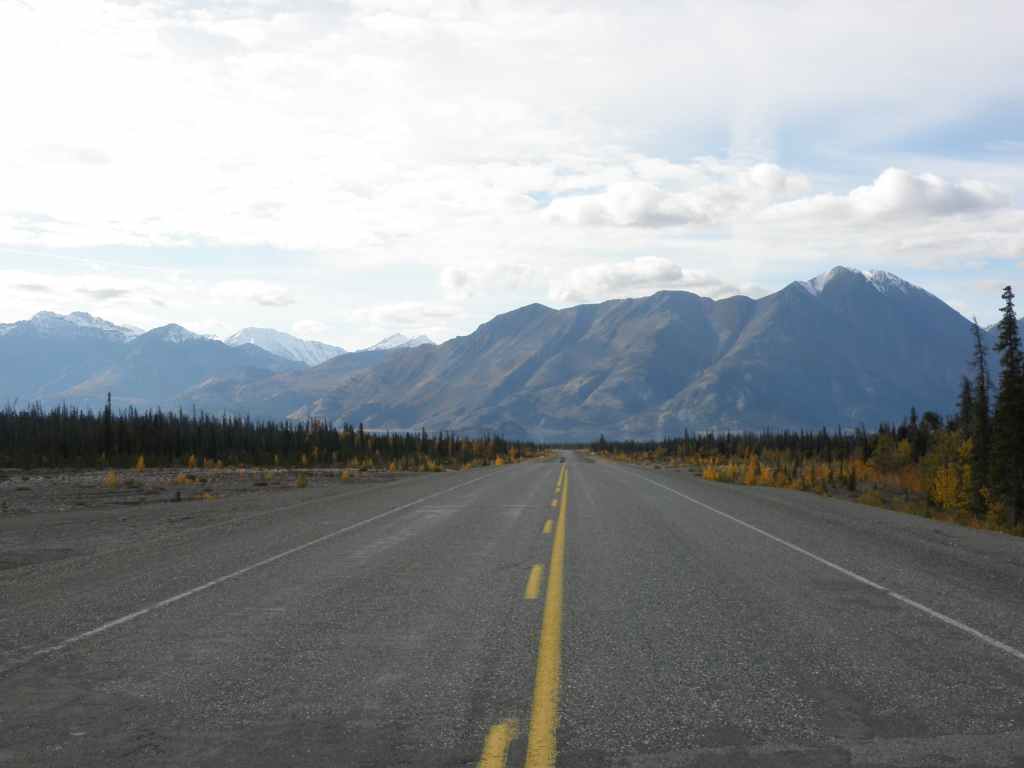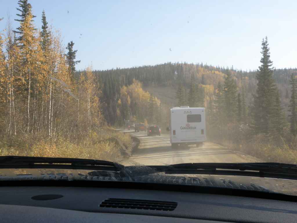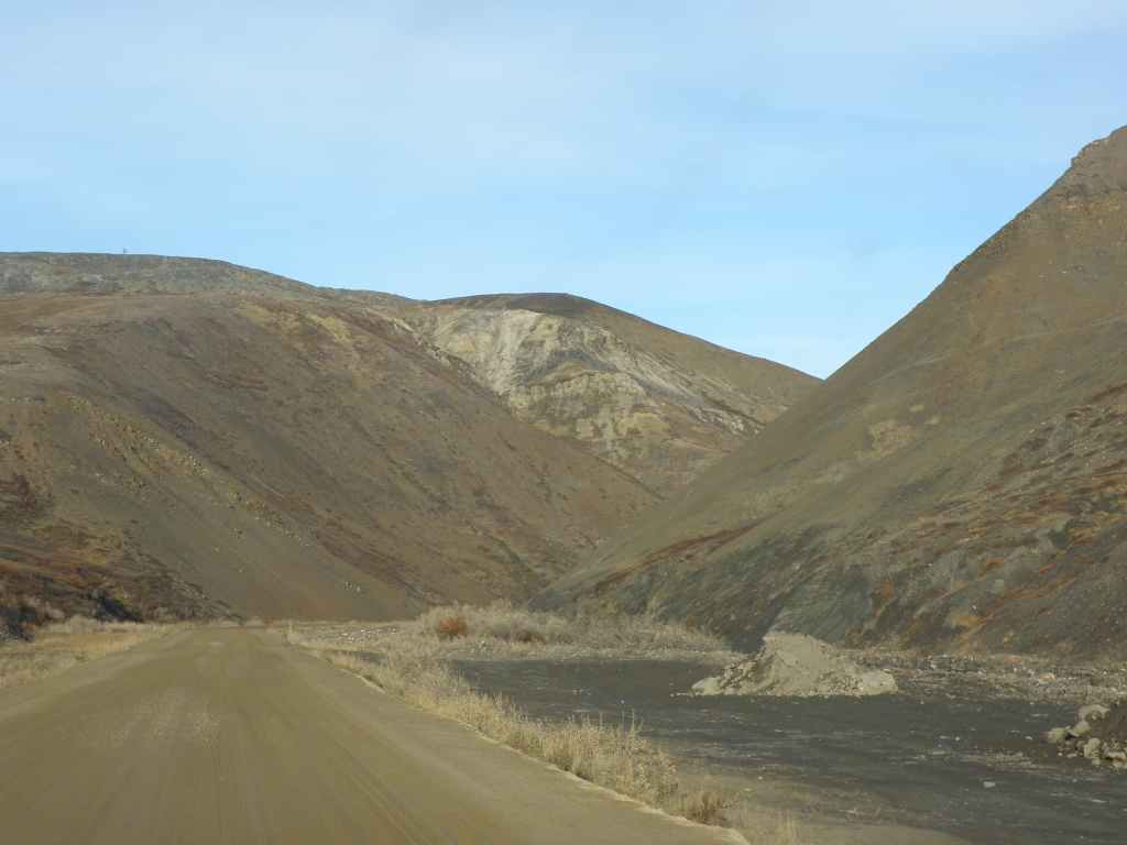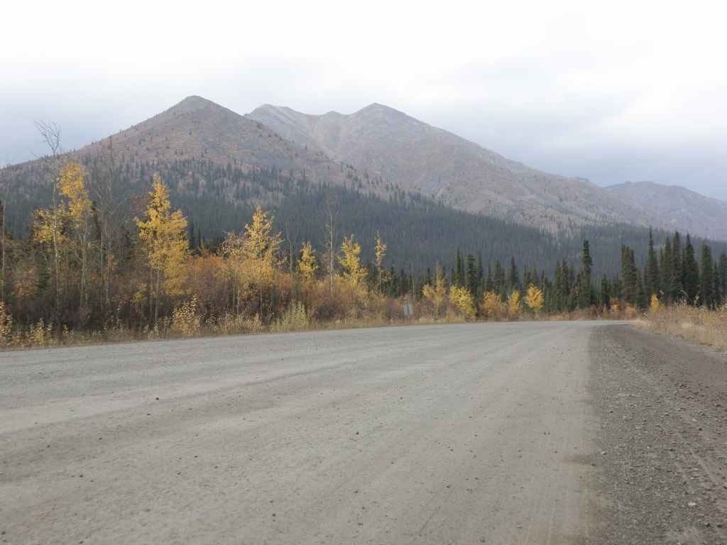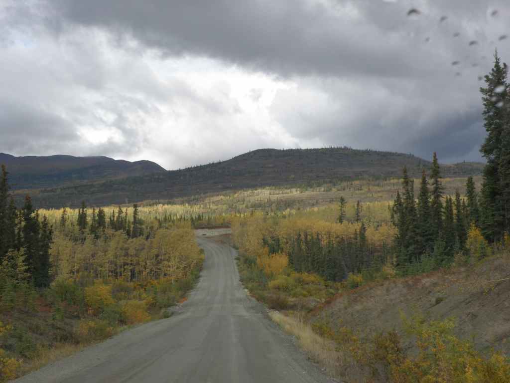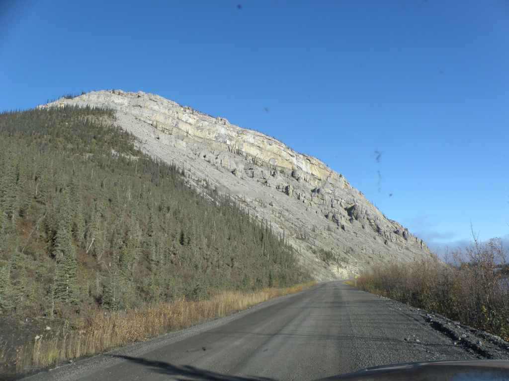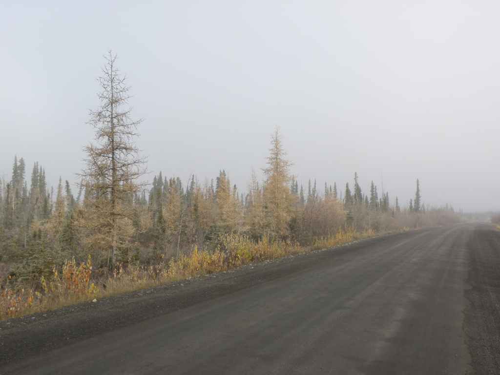Plus que 20 puis 10 km… on avance toujours et enfin la pancarte du village, mais il nous faut trouver la station… ça y est, on y est !!! On remplit le réservoir avec 130 litres de GO. On peut donc repartir tranquille mais dans quelle direction ? On hésite… le chemin prévu et le plus court passe par la Canol Highway mais celle-ci n’est plus entretenue pour la saison par les services de l’Etat. Elle passe par la montagne et peut être enneigée. De plus la fréquentation est minimum. On tente sur une quinzaine de kilomètre et puis finalement, on rebrousse chemin…