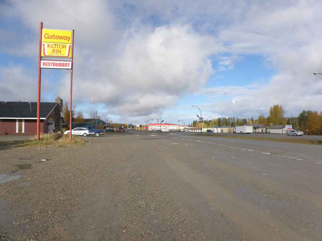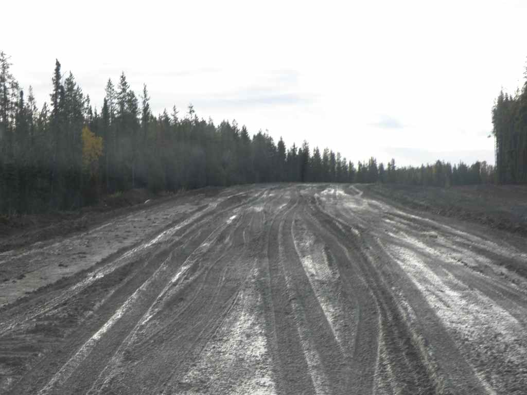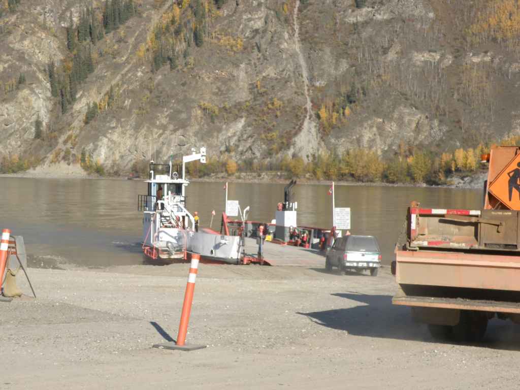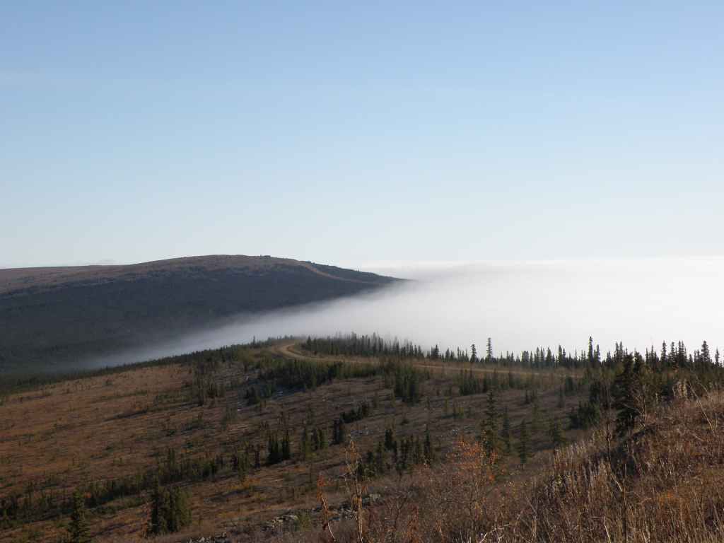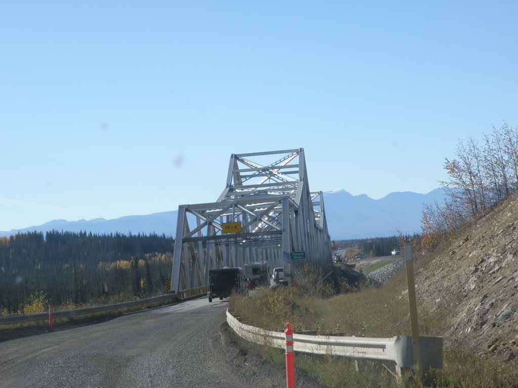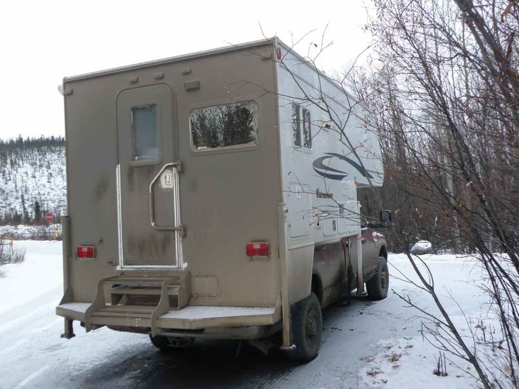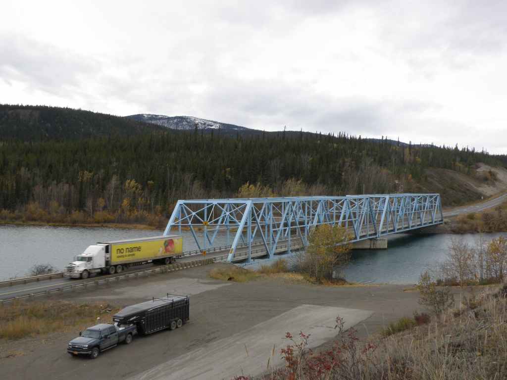 Plus que 20 puis 10 km… on avance toujours et enfin la pancarte du village, mais il nous faut trouver la station… ça y est, on y est !!! On remplit le réservoir avec 130 litres de GO. On peut donc repartir tranquille mais dans quelle direction ? On hésite… le chemin prévu et le plus court passe par la Canol Highway mais celle-ci n’est plus entretenue pour la saison par les services de l’Etat. Elle passe par la montagne et peut être enneigée. De plus la fréquentation est minimum. On tente sur une quinzaine de kilomètre et puis finalement, on rebrousse chemin…