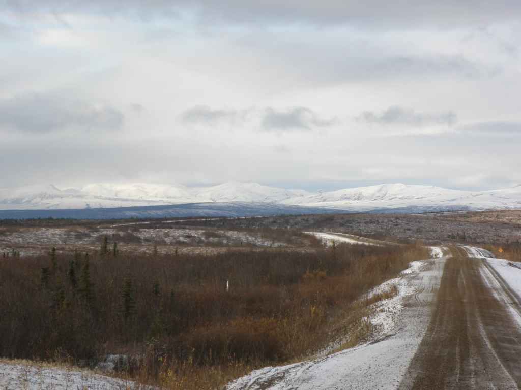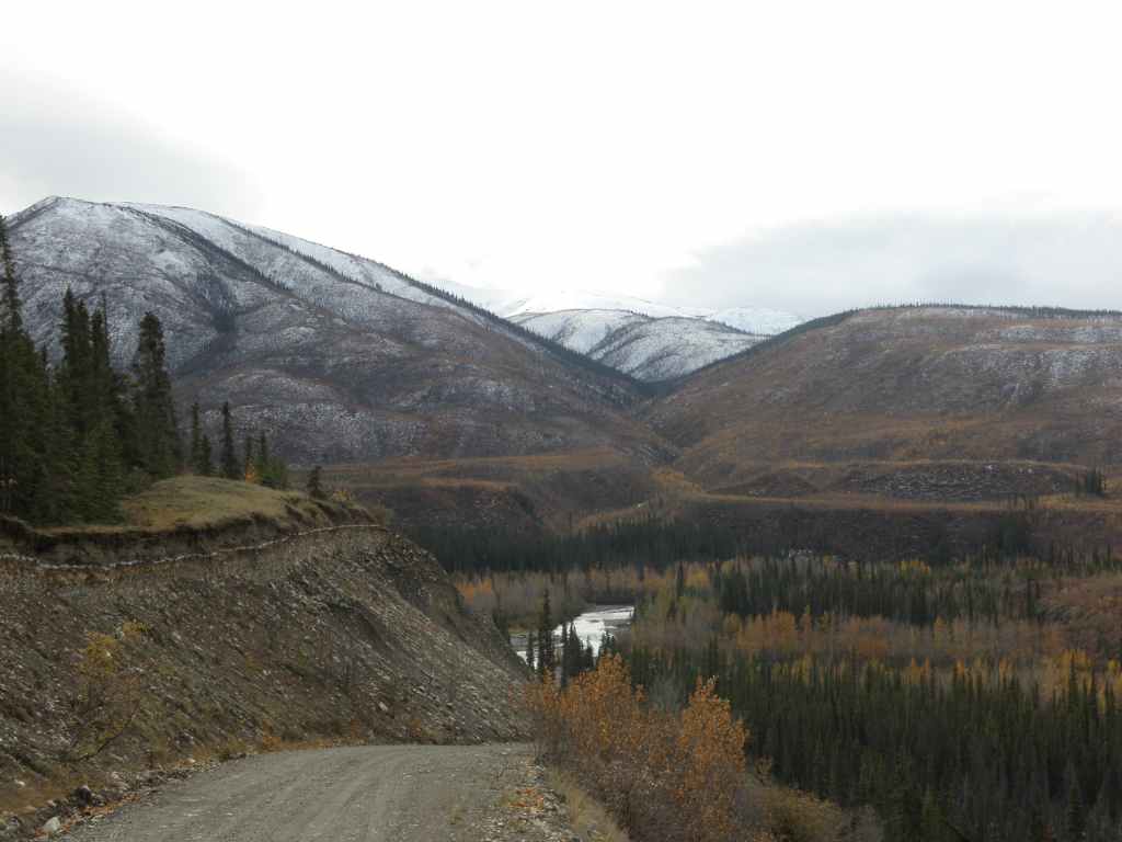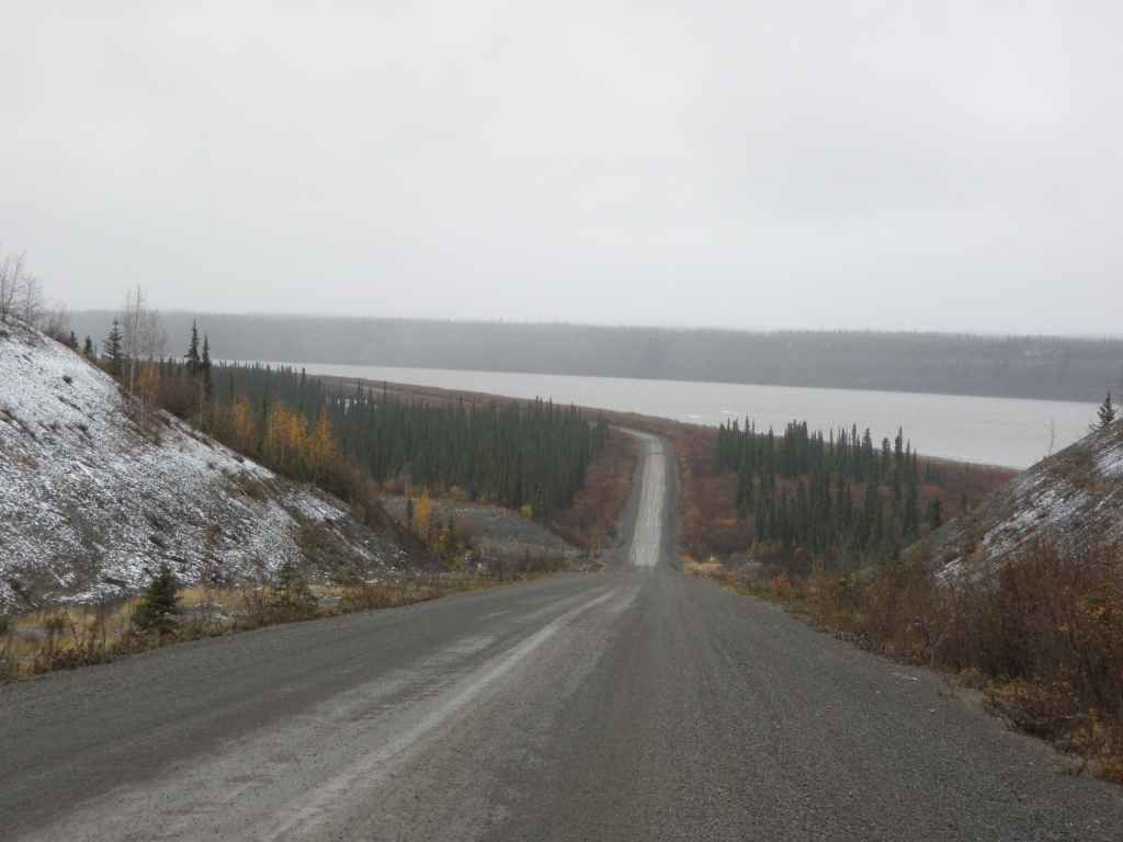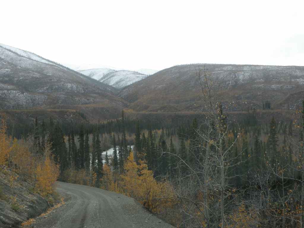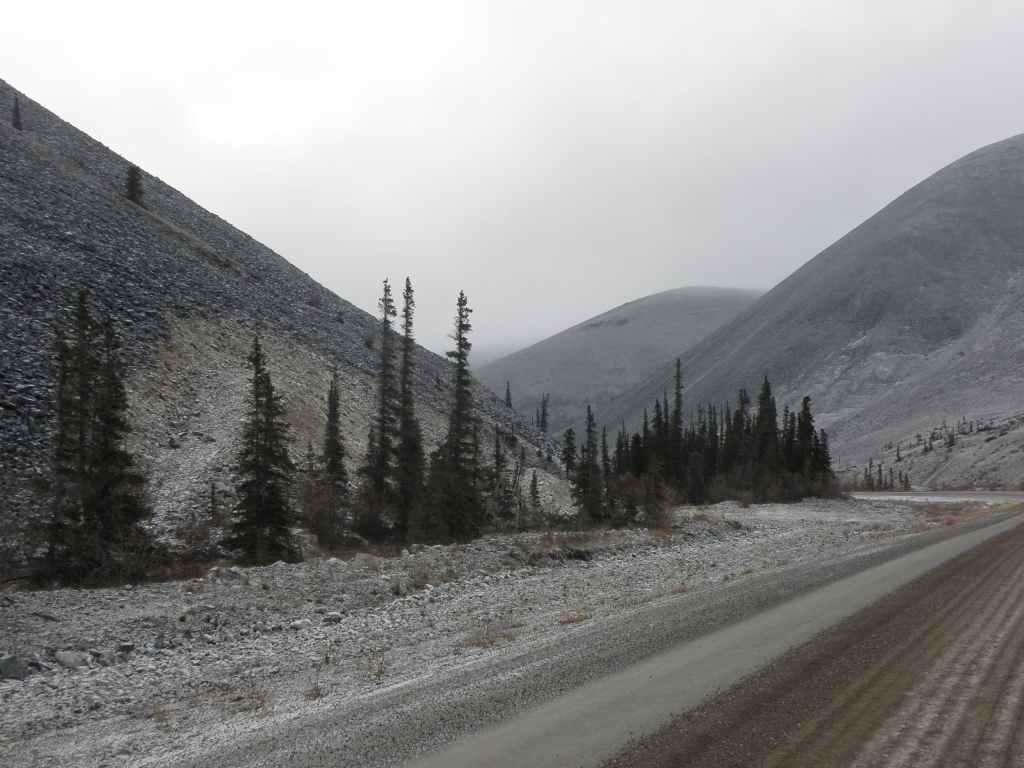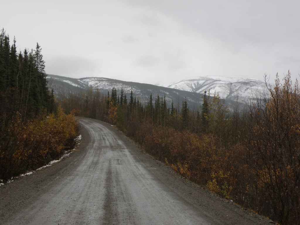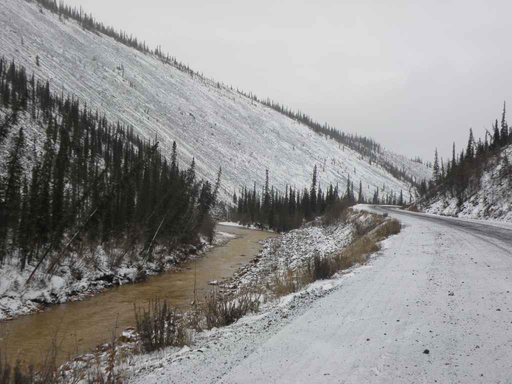 Lever matinal et départ de nuit. Il fait -1°C et la route est recouverte d’une fine couche de neige. Je roule doucement, ne sachant pas comment réagit un véhicule à boîte automatique sur la neige.Entre les averses de neige, quelques éclaircies apparaissent. On repasse les rivières avec les traversiers et on s’arrête à fort Macpherson pour ravitailler en gas-oil. la température descend en montagne à -2°C. Une côte raide et enneigée nous ramène dans le Yukon. Là, un routier chaine les roues du tracteur et mets des pneus neige à la remorque, afin de descendre la côte que nous venons de monter. Il nous signale qu’un grizzly est passé il y a peu. En effet de belles empreintes tapissent la neige. Nous repartons.