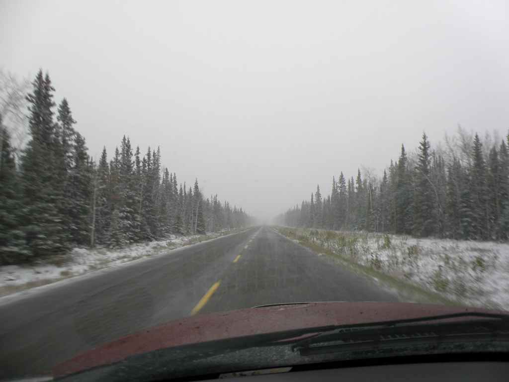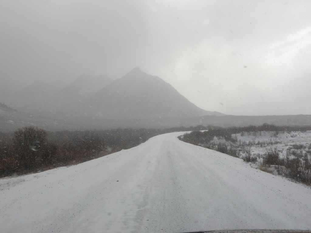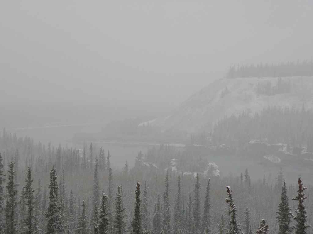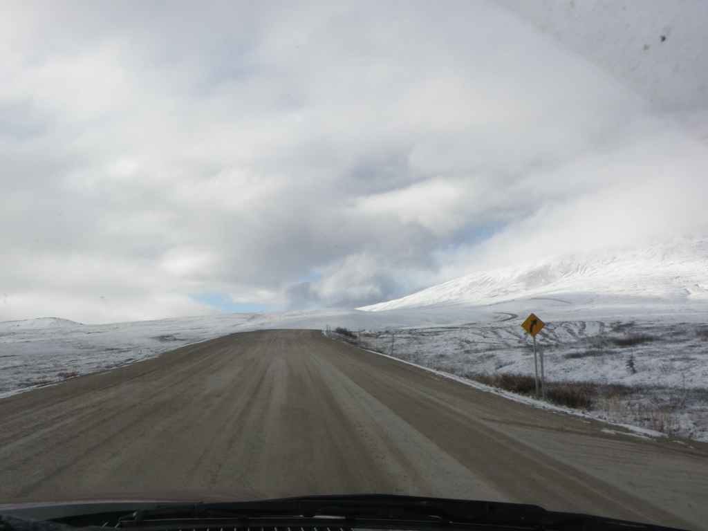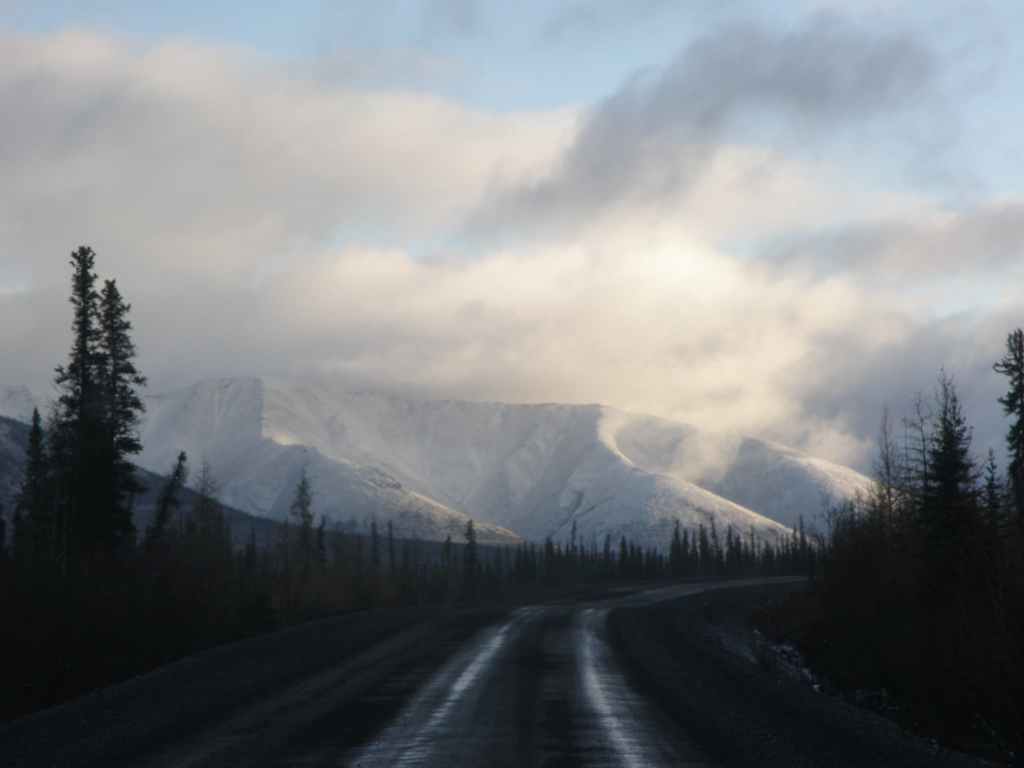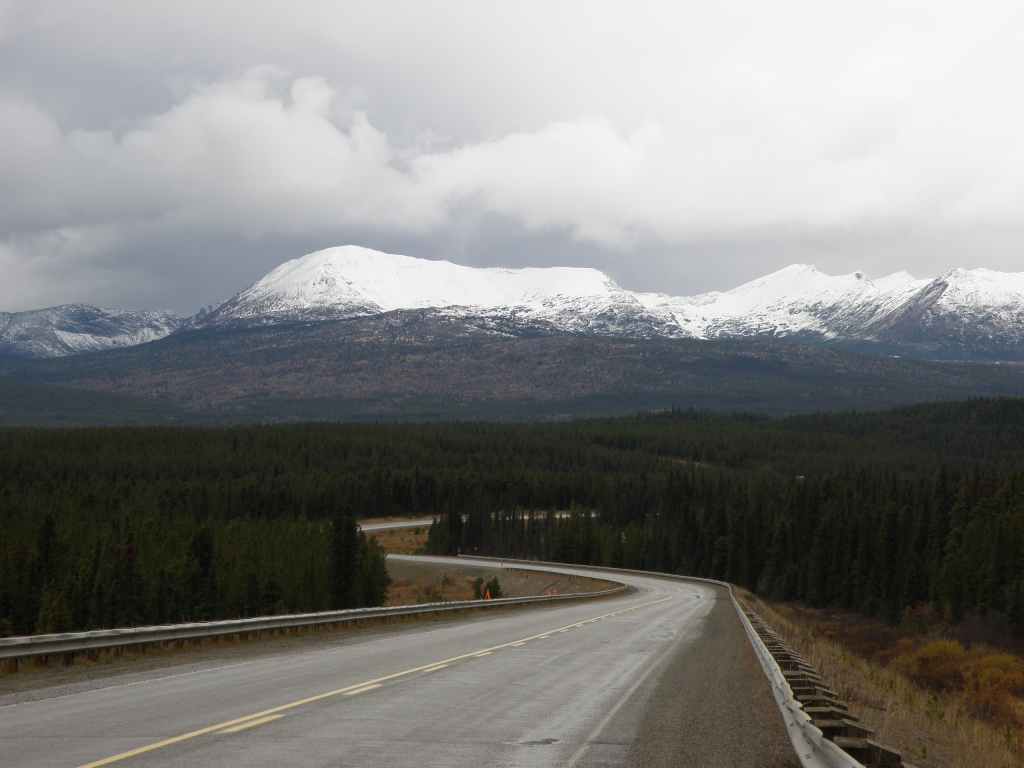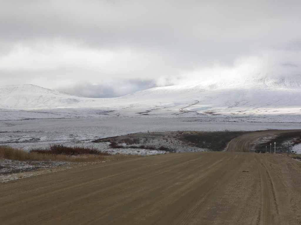 Lever matinal et départ de nuit. Il fait -1°C et la route est recouverte d’une fine couche de neige. Je roule doucement, ne sachant pas comment réagit un véhicule à boîte automatique sur la neige.Entre les averses de neige, quelques éclaircies apparaissent. On repasse les rivières avec les traversiers et on s’arrête à fort Macpherson pour ravitailler en gas-oil. la température descend en montagne à -2°C. Une côte raide et enneigée nous ramène dans le Yukon. Là, un routier chaine les roues du tracteur et mets des pneus neige à la remorque, afin de descendre la côte que nous venons de monter. Il nous signale qu’un grizzly est passé il y a peu. En effet de belles empreintes tapissent la neige. Nous repartons.