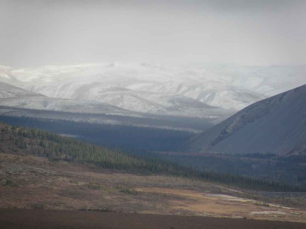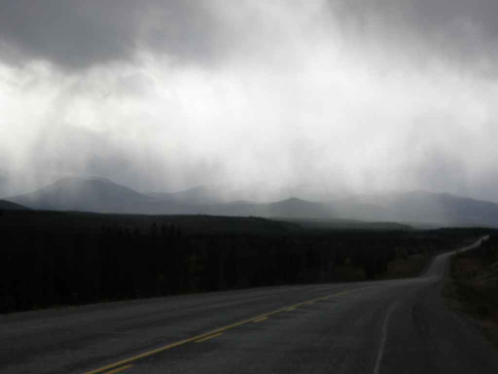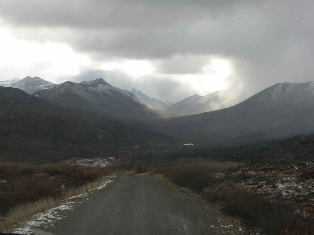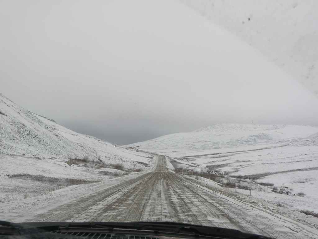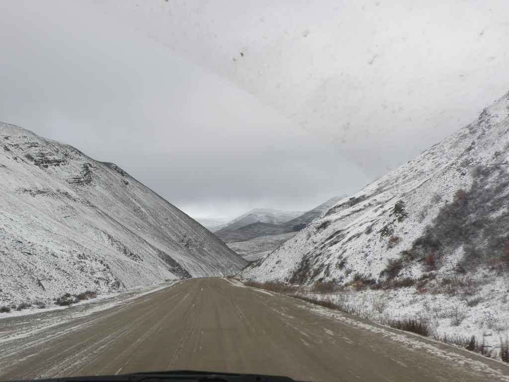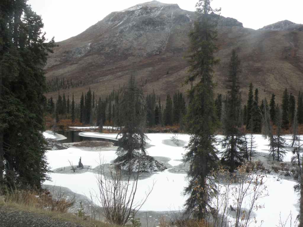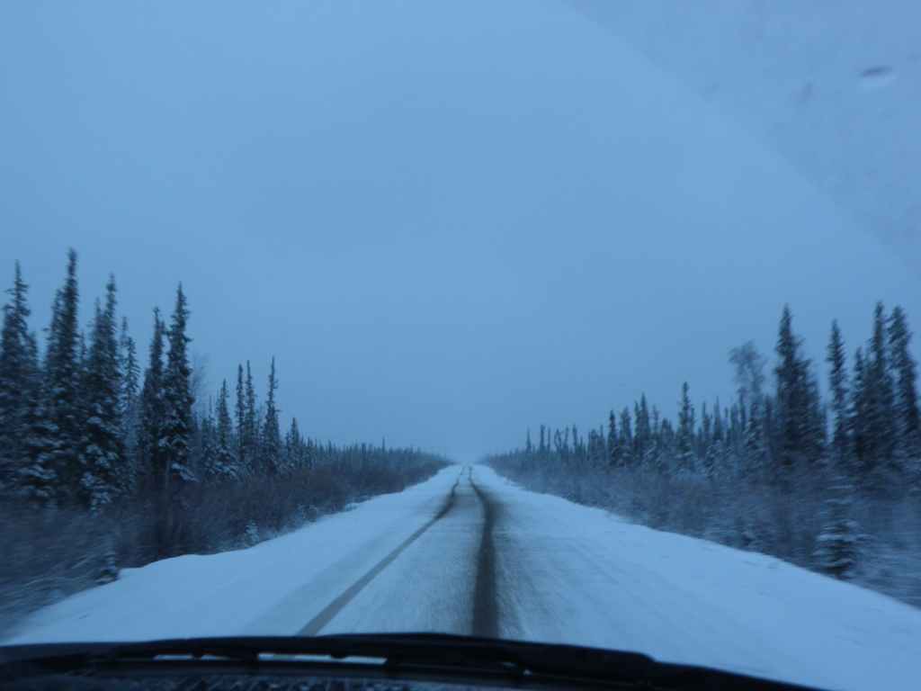 Lever matinal et départ de nuit. Il fait -1°C et la route est recouverte d’une fine couche de neige. Je roule doucement, ne sachant pas comment réagit un véhicule à boîte automatique sur la neige.Entre les averses de neige, quelques éclaircies apparaissent. On repasse les rivières avec les traversiers et on s’arrête à fort Macpherson pour ravitailler en gas-oil. la température descend en montagne à -2°C. Une côte raide et enneigée nous ramène dans le Yukon. Là, un routier chaine les roues du tracteur et mets des pneus neige à la remorque, afin de descendre la côte que nous venons de monter. Il nous signale qu’un grizzly est passé il y a peu. En effet de belles empreintes tapissent la neige. Nous repartons.