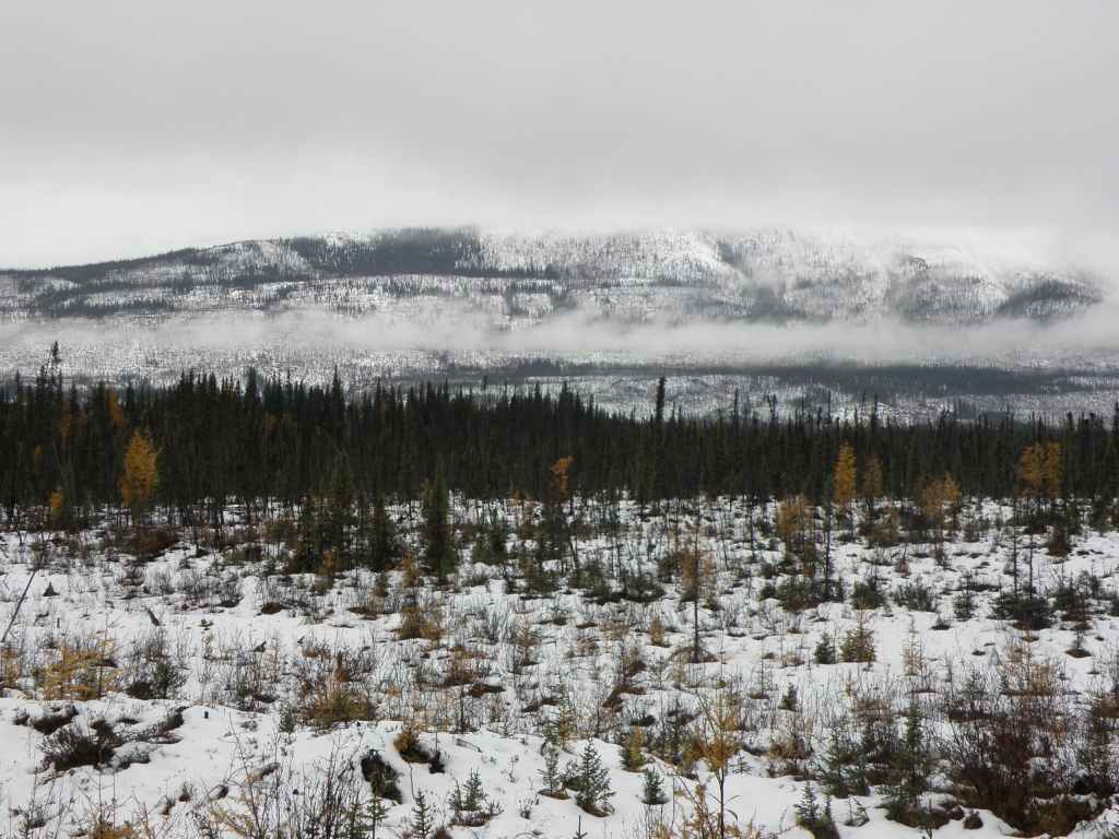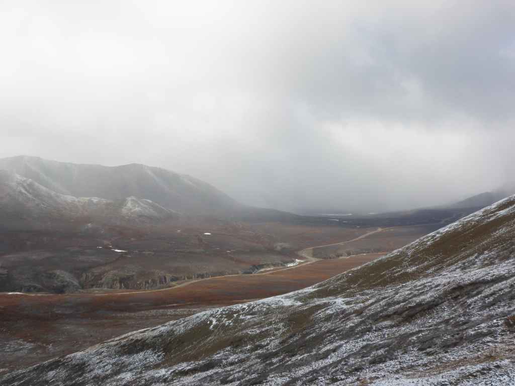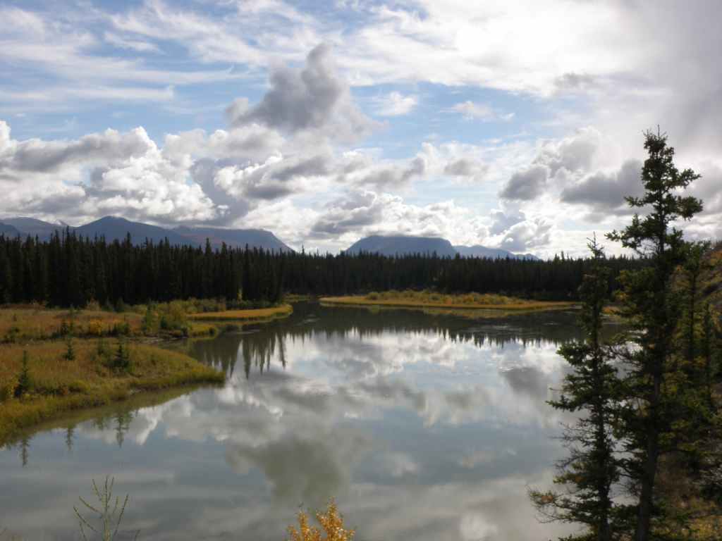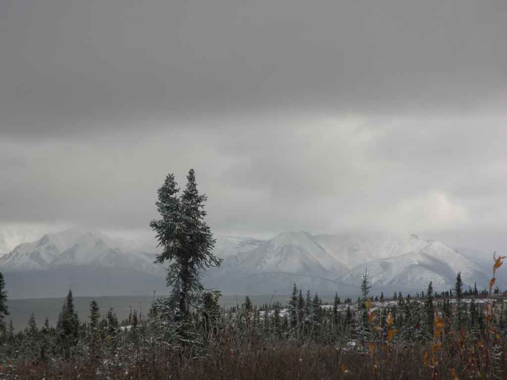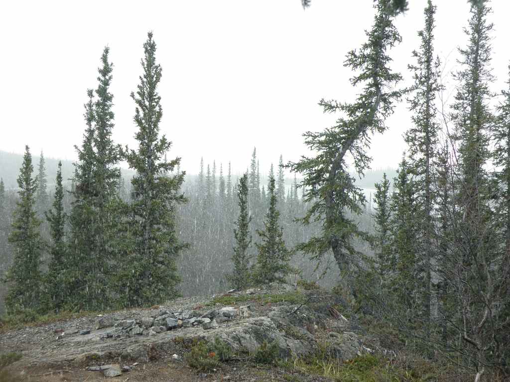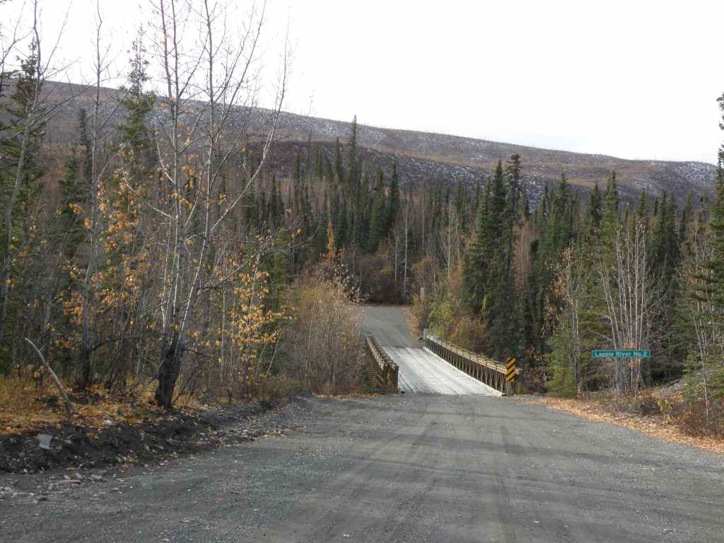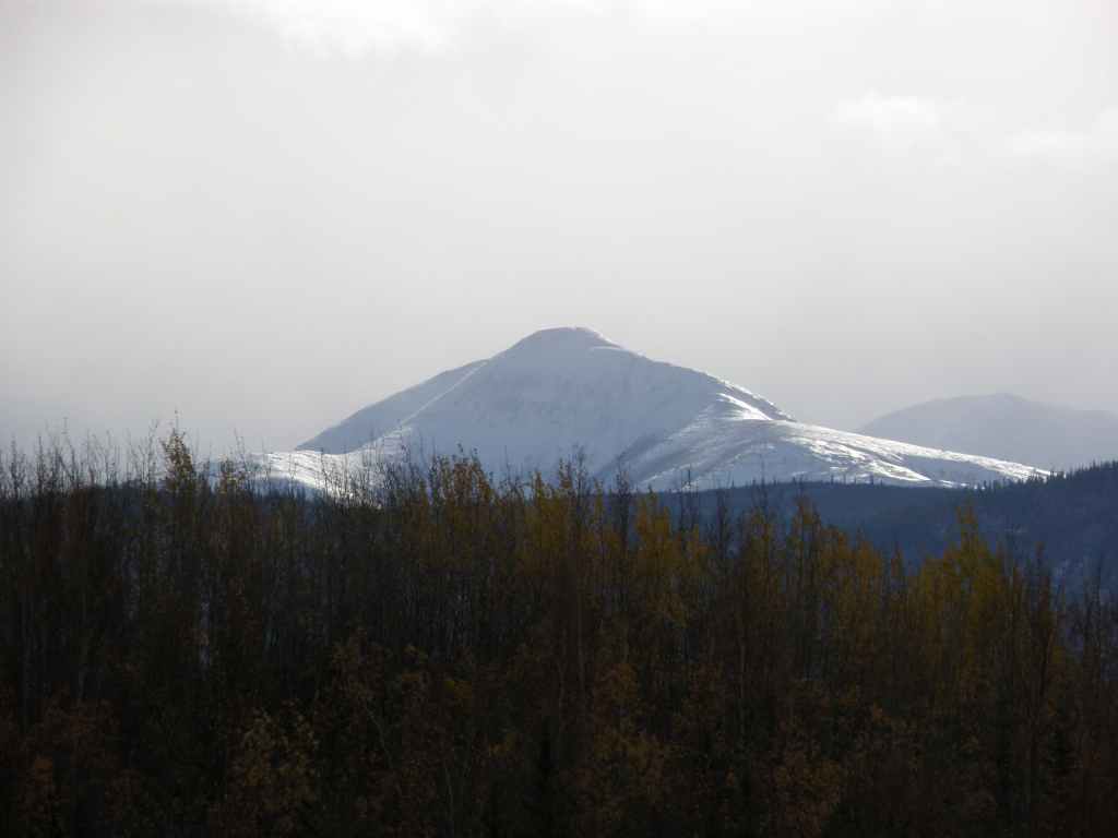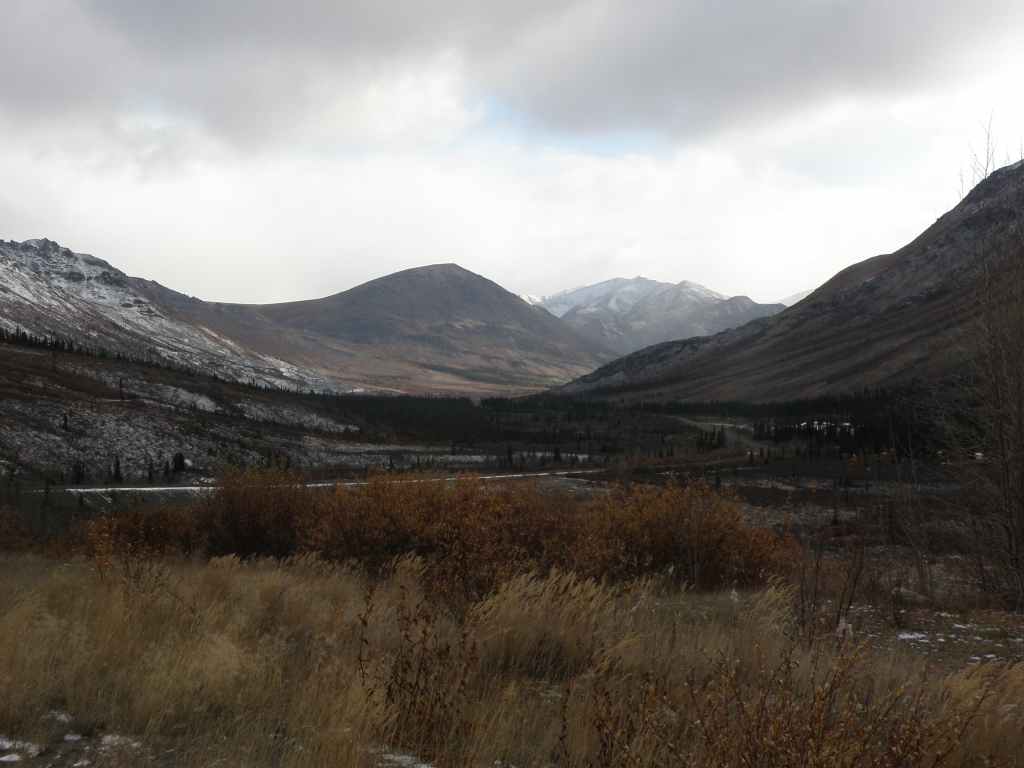 Lever matinal et départ de nuit. Il fait -1°C et la route est recouverte d’une fine couche de neige. Je roule doucement, ne sachant pas comment réagit un véhicule à boîte automatique sur la neige.Entre les averses de neige, quelques éclaircies apparaissent. On repasse les rivières avec les traversiers et on s’arrête à fort Macpherson pour ravitailler en gas-oil. la température descend en montagne à -2°C. Une côte raide et enneigée nous ramène dans le Yukon. Là, un routier chaine les roues du tracteur et mets des pneus neige à la remorque, afin de descendre la côte que nous venons de monter. Il nous signale qu’un grizzly est passé il y a peu. En effet de belles empreintes tapissent la neige. Nous repartons.