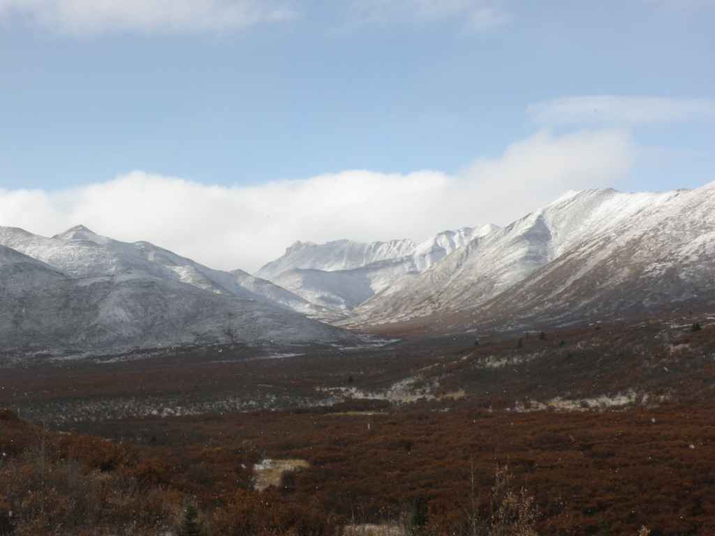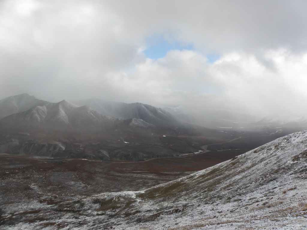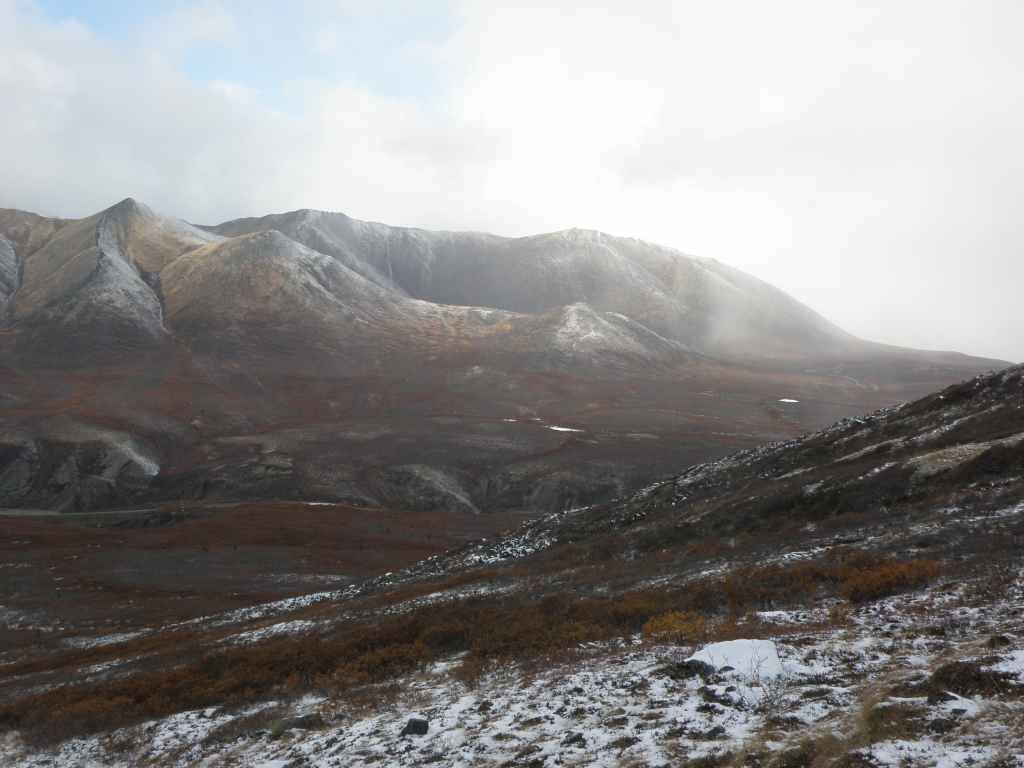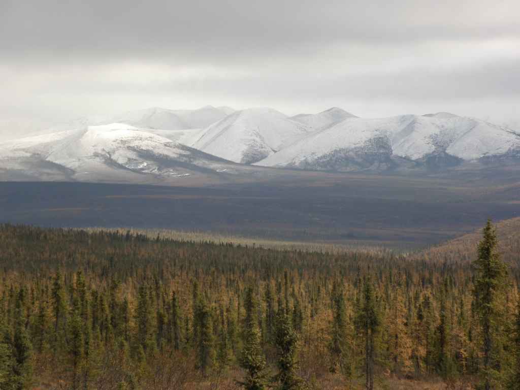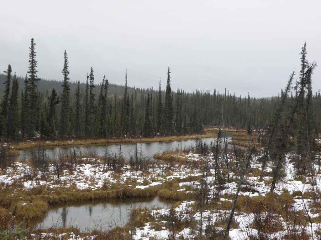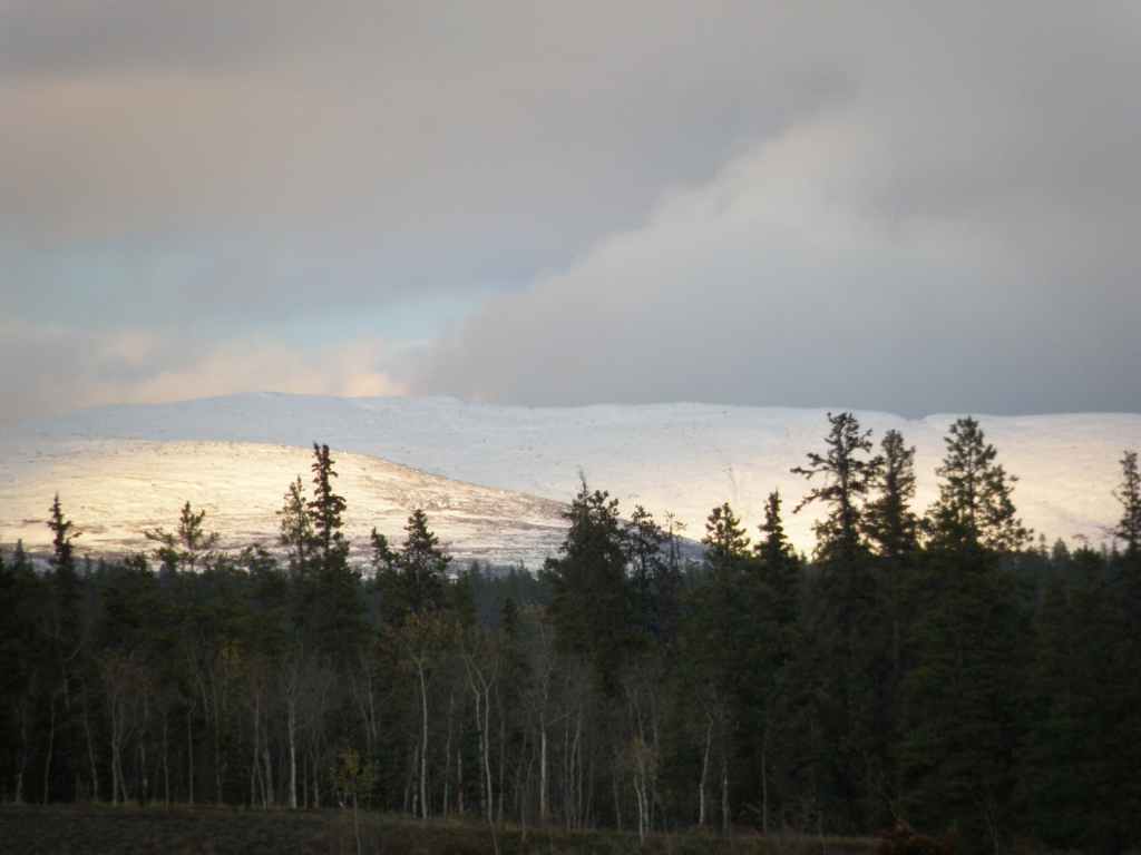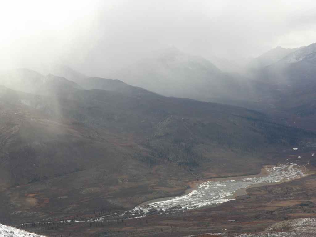 Lever matinal et départ de nuit. Il fait -1°C et la route est recouverte d’une fine couche de neige. Je roule doucement, ne sachant pas comment réagit un véhicule à boîte automatique sur la neige.Entre les averses de neige, quelques éclaircies apparaissent. On repasse les rivières avec les traversiers et on s’arrête à fort Macpherson pour ravitailler en gas-oil. la température descend en montagne à -2°C. Une côte raide et enneigée nous ramène dans le Yukon. Là, un routier chaine les roues du tracteur et mets des pneus neige à la remorque, afin de descendre la côte que nous venons de monter. Il nous signale qu’un grizzly est passé il y a peu. En effet de belles empreintes tapissent la neige. Nous repartons.