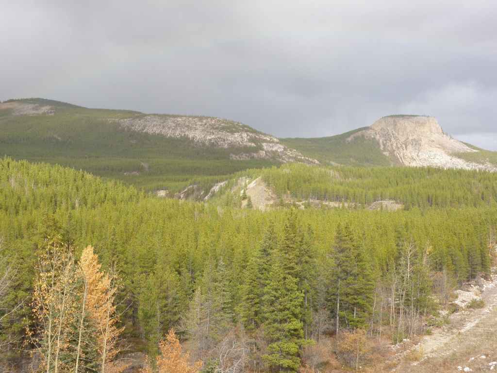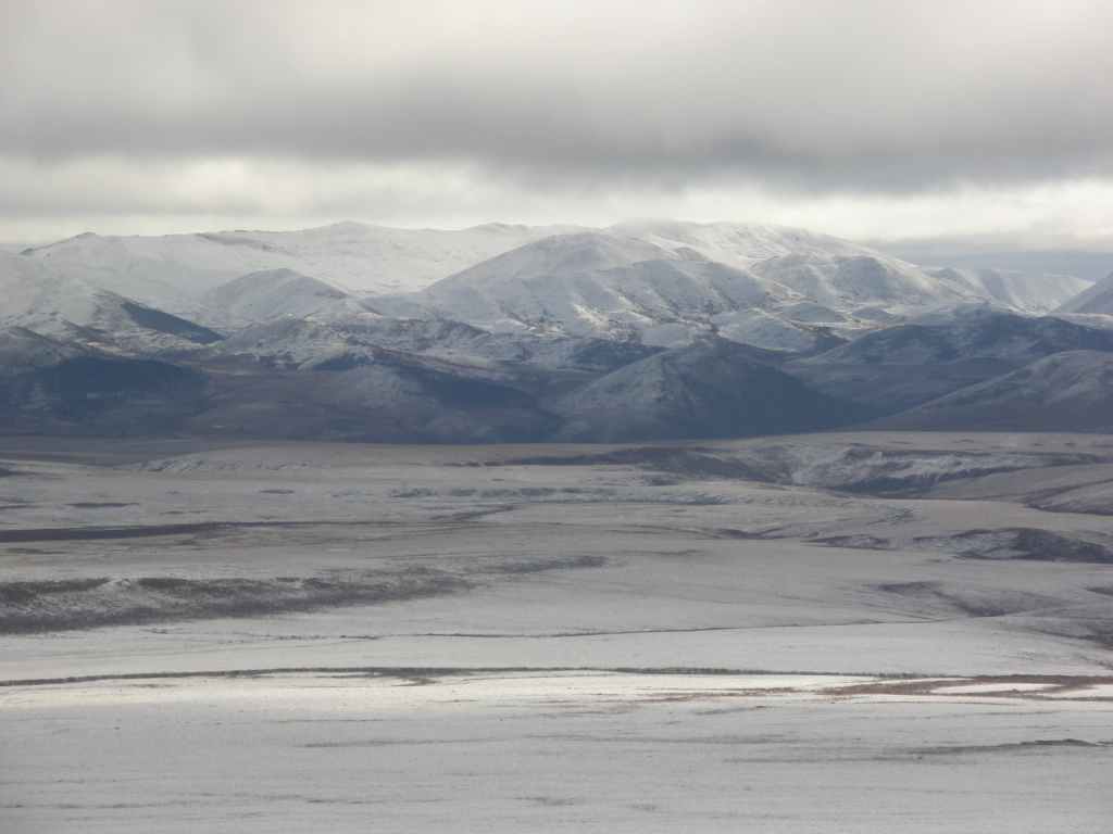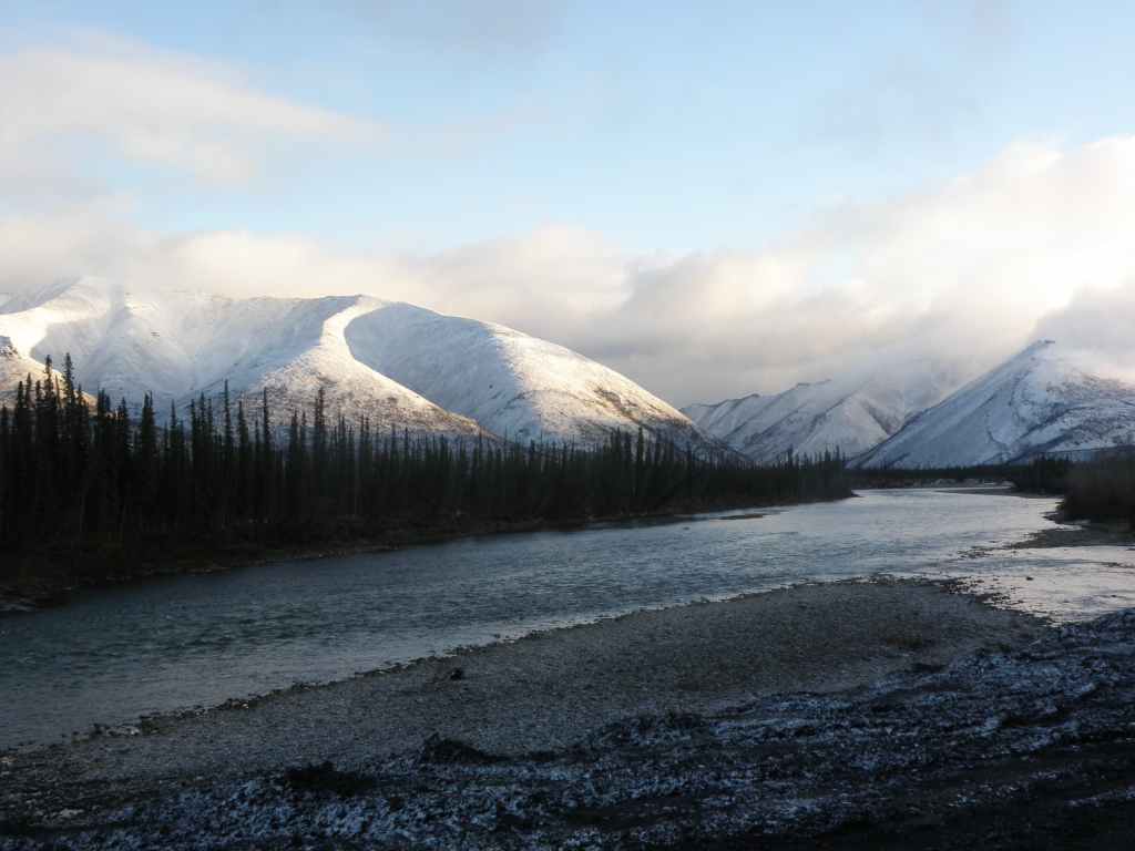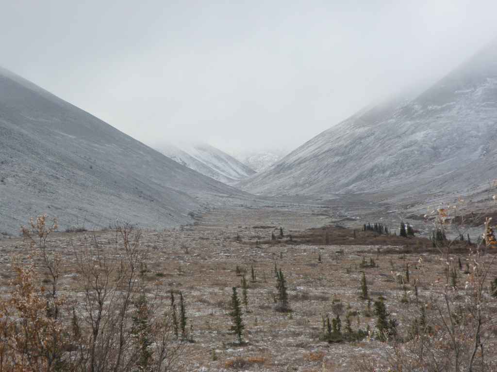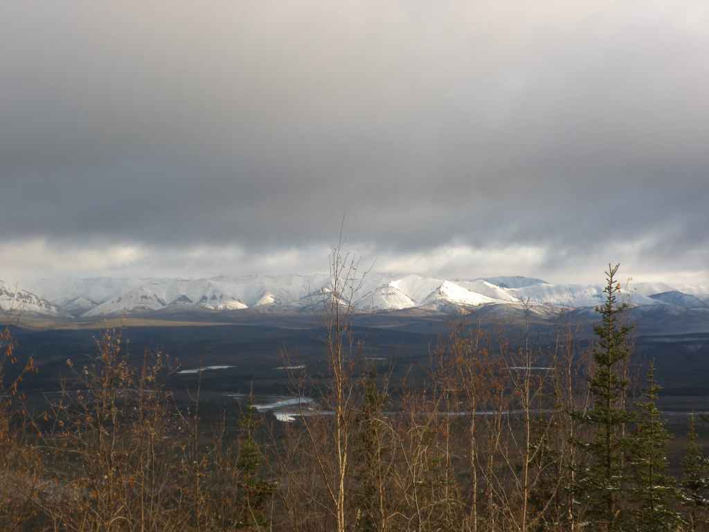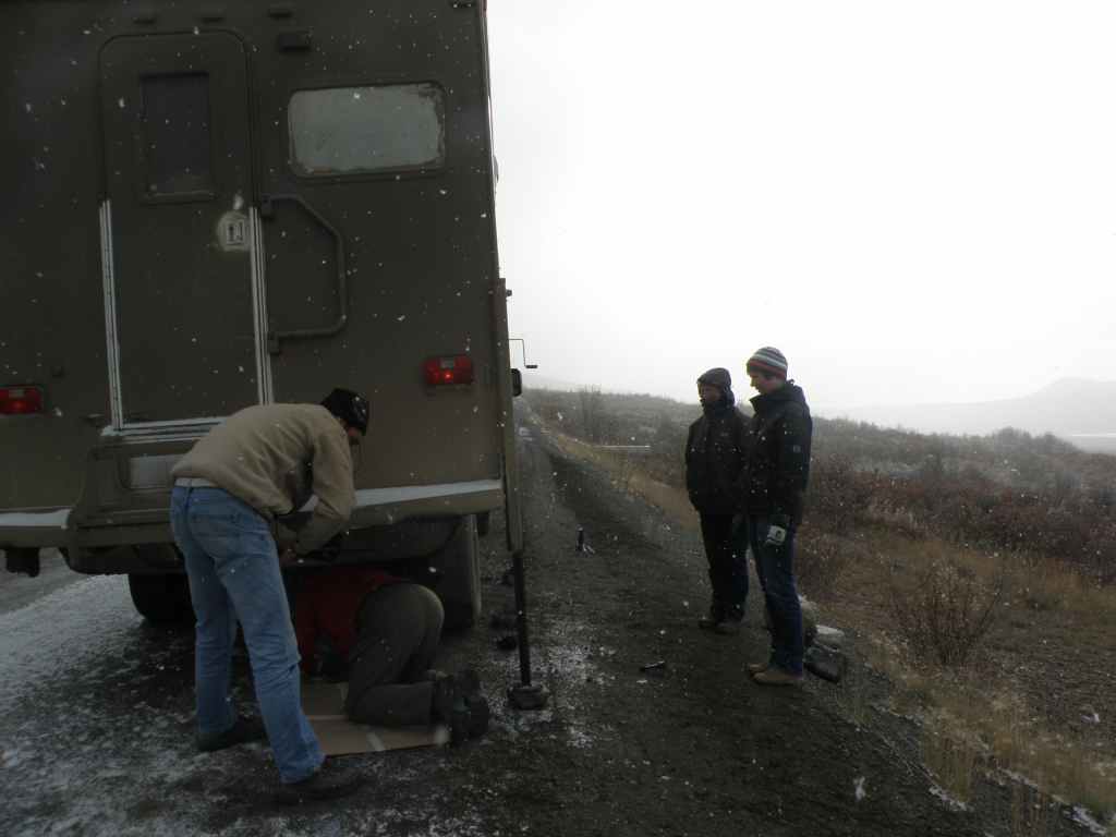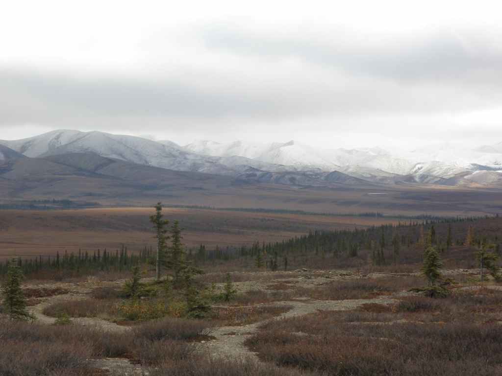Lever matinal et départ de nuit. Il fait -1°C et la route est recouverte d’une fine couche de neige. Je roule doucement, ne sachant pas comment réagit un véhicule à boîte automatique sur la neige.Entre les averses de neige, quelques éclaircies apparaissent. On repasse les rivières avec les traversiers et on s’arrête à fort Macpherson pour ravitailler en gas-oil. la température descend en montagne à -2°C. Une côte raide et enneigée nous ramène dans le Yukon. Là, un routier chaine les roues du tracteur et mets des pneus neige à la remorque, afin de descendre la côte que nous venons de monter. Il nous signale qu’un grizzly est passé il y a peu. En effet de belles empreintes tapissent la neige. Nous repartons.