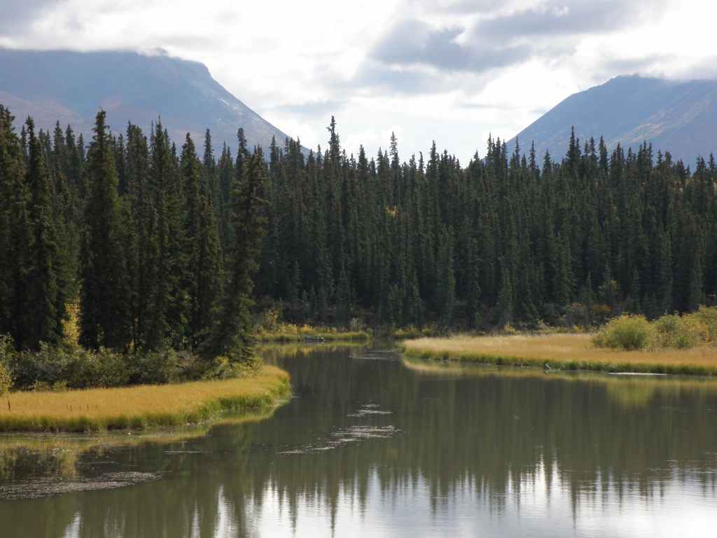 Nous traversons la jolie rivière Takhini puis traversons un petit village des « Premières Nations » (indiens) se nommant Champagne ! Arrivés à Haines Junction, nous ravitaillons à l’épicerie du village et visitons la maison du parc. Nuit en camping.