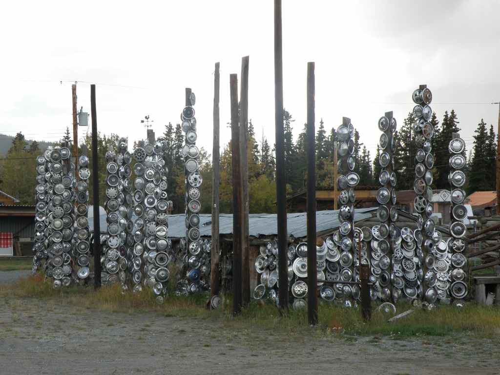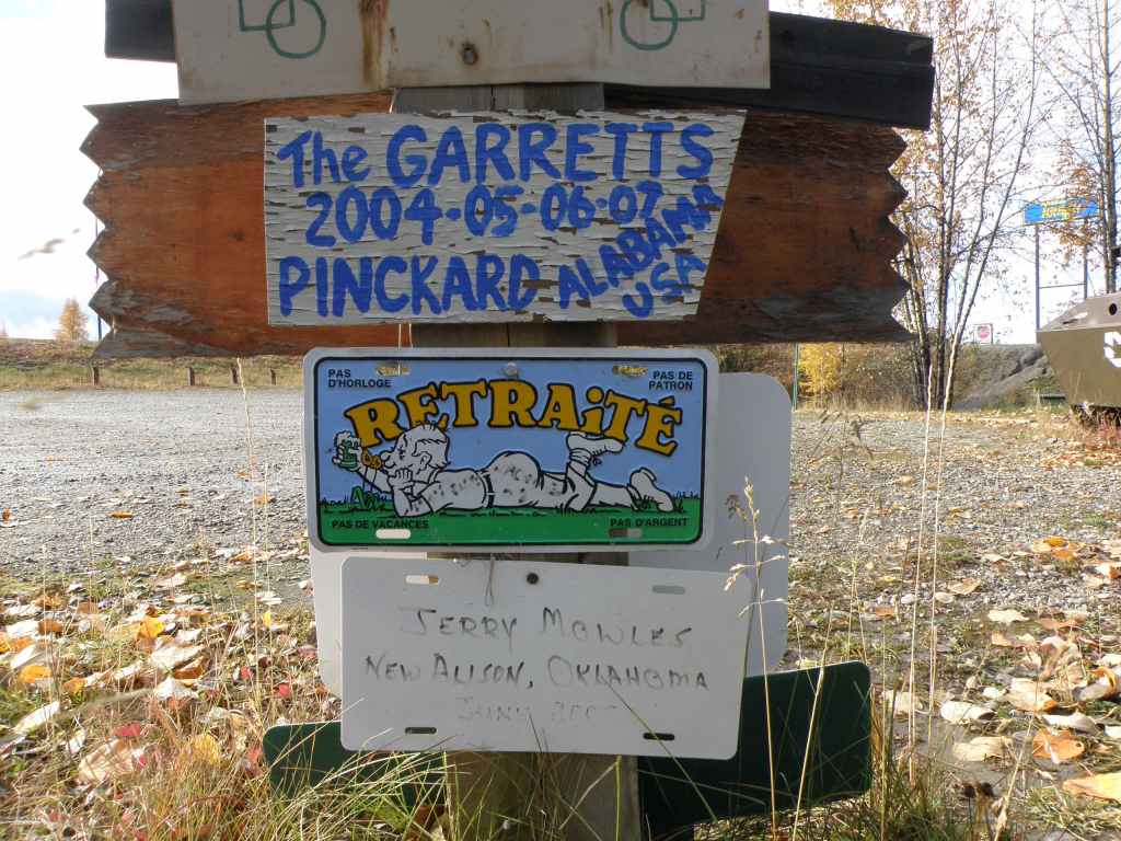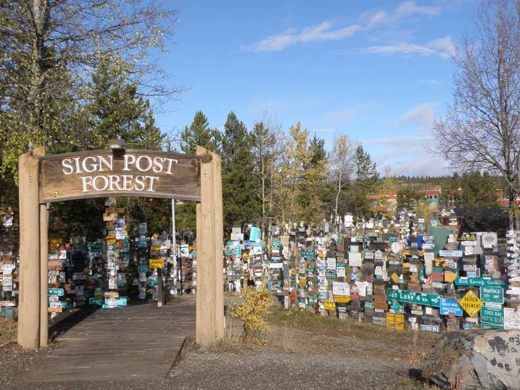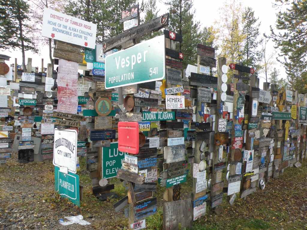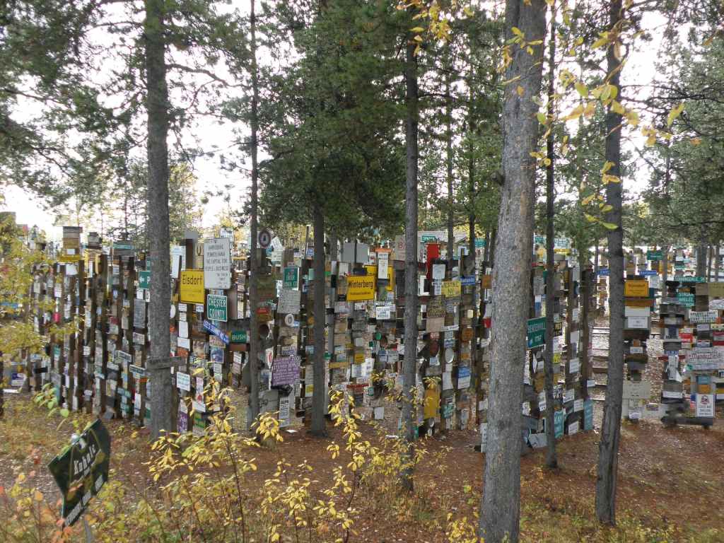 Et un poids lourd qui arrive en sens inverse s’arrête au-dessus d’une côte pour nous laisser passer, sachant qu’on tient toute la route pour grimper ! Lui aussi devra traverser la zone : bon courage ! On arrive enfin à Watson Lake où une pose s’impose : il y a en effet ici une curiosité unique : la « Signpost Forest », la forêt de panneaux. En effet, en 1942, un soldat américain qui construisait l’Alaska Highway a déposé un panneau indicateur avec le nom de son village et les kilomètres qui les séparaient. Depuis les voyageurs font de même et en 2005, 500000 panneaux décoraient le lieu !