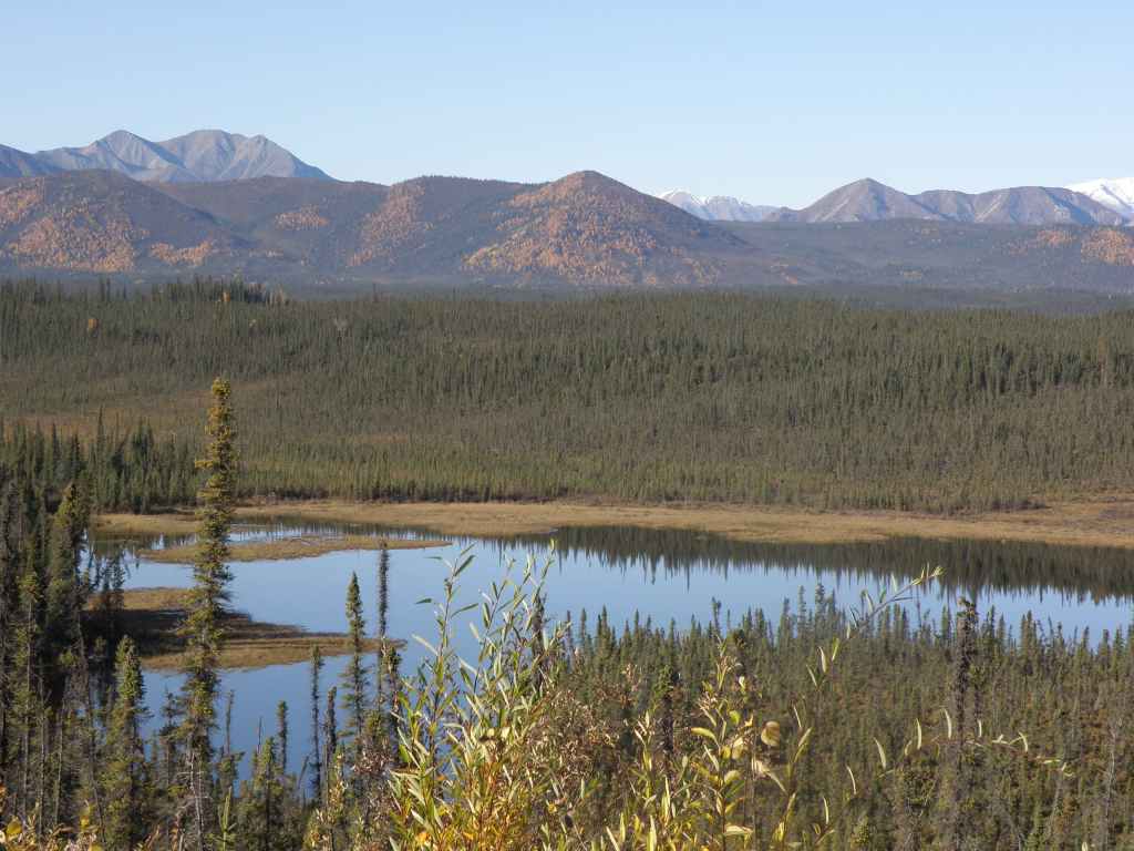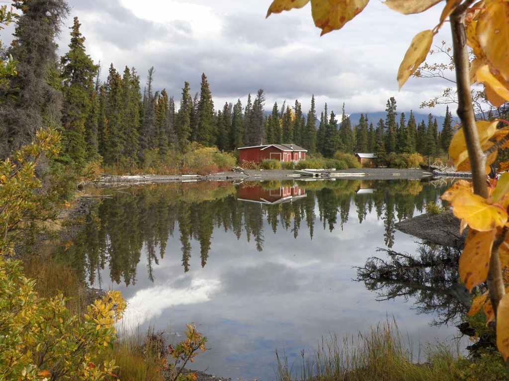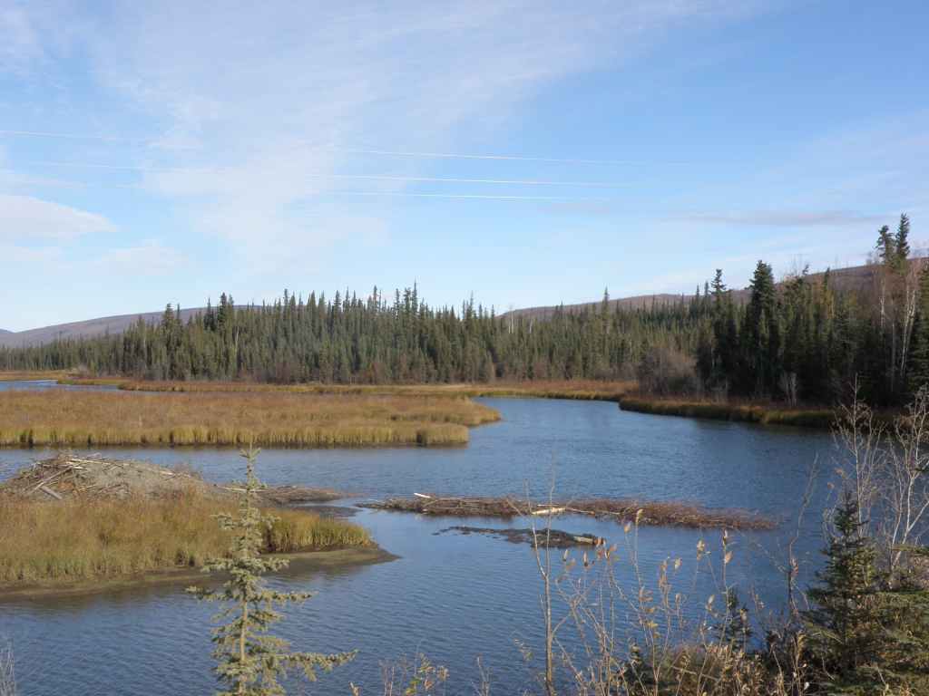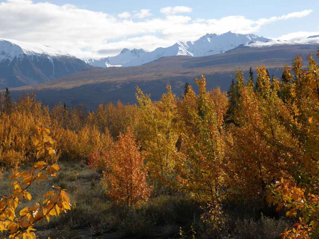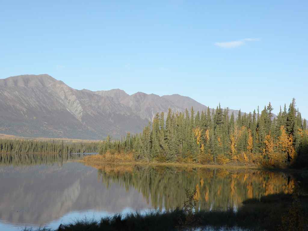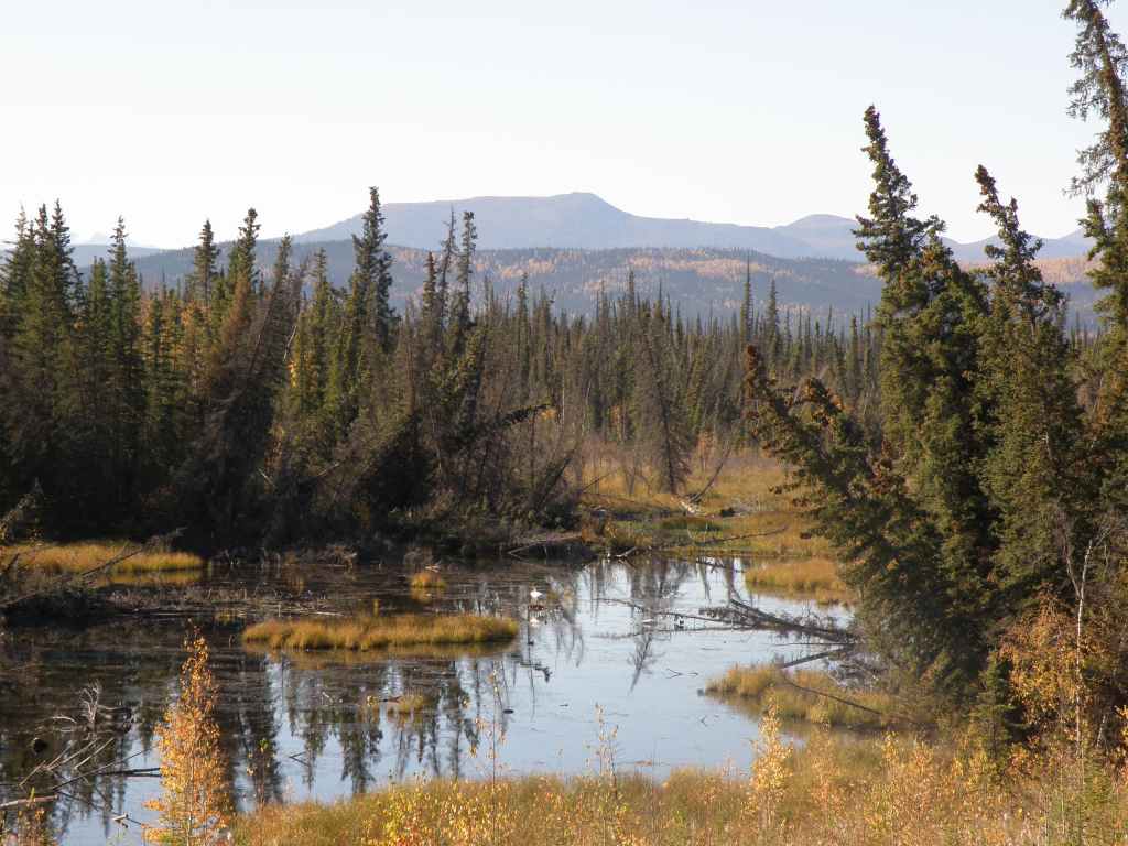 -5°C ce matin… grosse étape sur une Alaska Highway bien défoncée par la fonte du permafrost (sol gelé toute l’année). On passe à Beaver Creek (ruisseau du castor), petit village où il n’ya rien, à peine de quoi acheter une boîte de conserve ! Puis nous retraversons la frontière américaine avec les mêmes systèmes de sécurité que précédemment. Nous traversons des paysages de lacs, marécages jaunis par l’automne, sur fond de hautes montagnes… c’est, comme d’habitude, grandiose. Nous arrivons enfin à Tok en Alaska. Comme dans le Yukon, l’agglomération ne ressemble à rien : une grande artère, très large, avec quelques maisons et magasins… Nous visitons un Gift Shop (magasin de souvenirs) où nous pouvons acheter toutes sortes de fourrures, de la peau de castor à la peau de grizzly, en passant par le lynx et le loup… Comme nous voulons éviter au maximum les campings, nous trouvons une petite place vers un lac, un peu à l’écart de la route, dans un sanctuaire pour orignaux, alors nous espérons en voir…