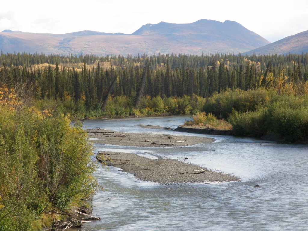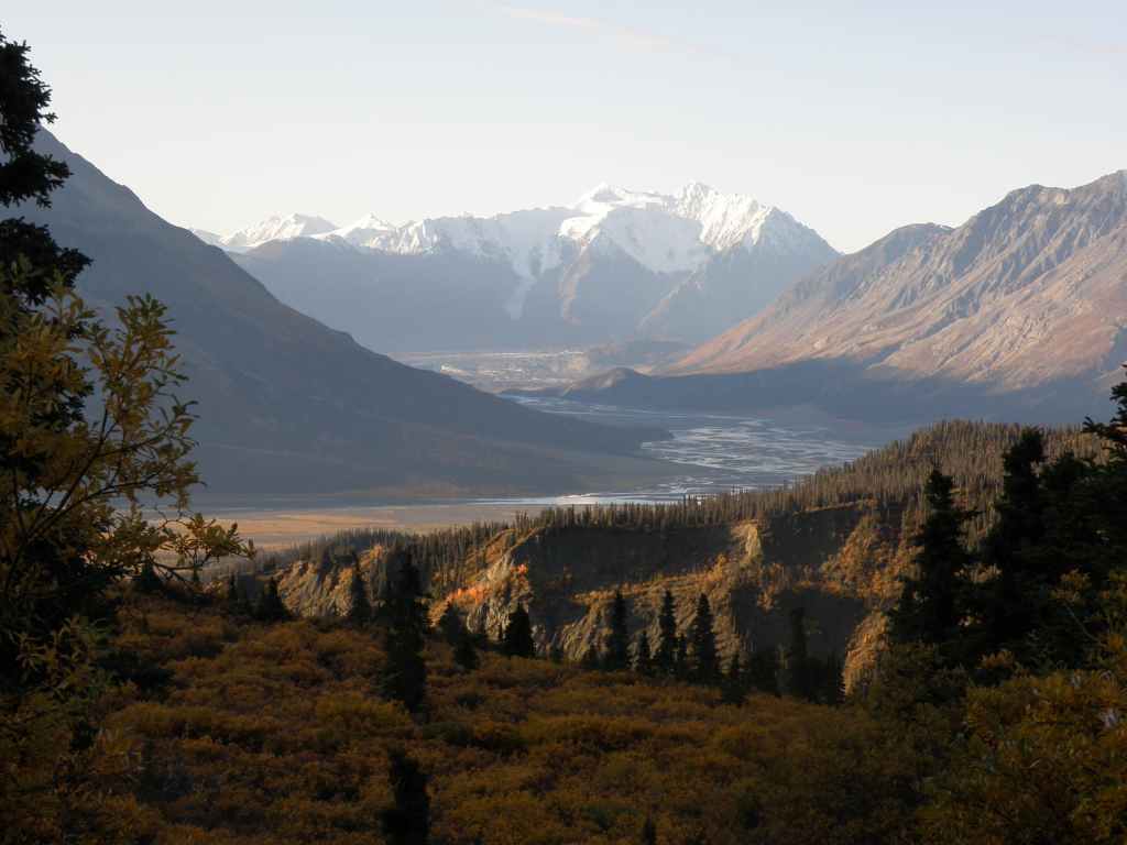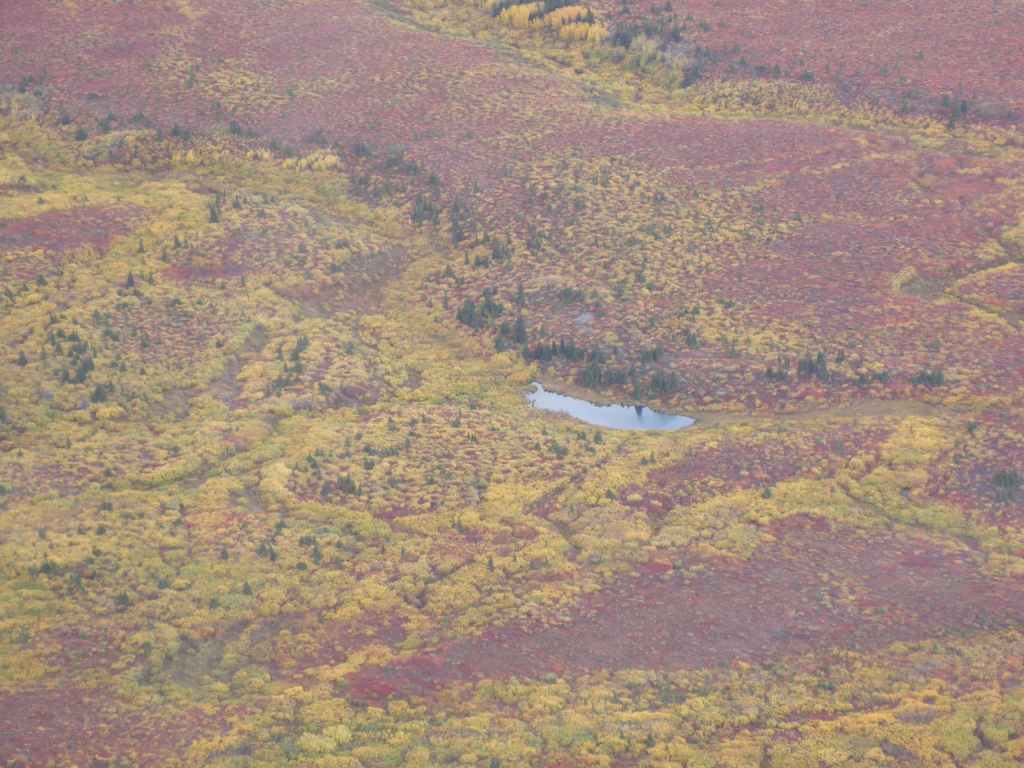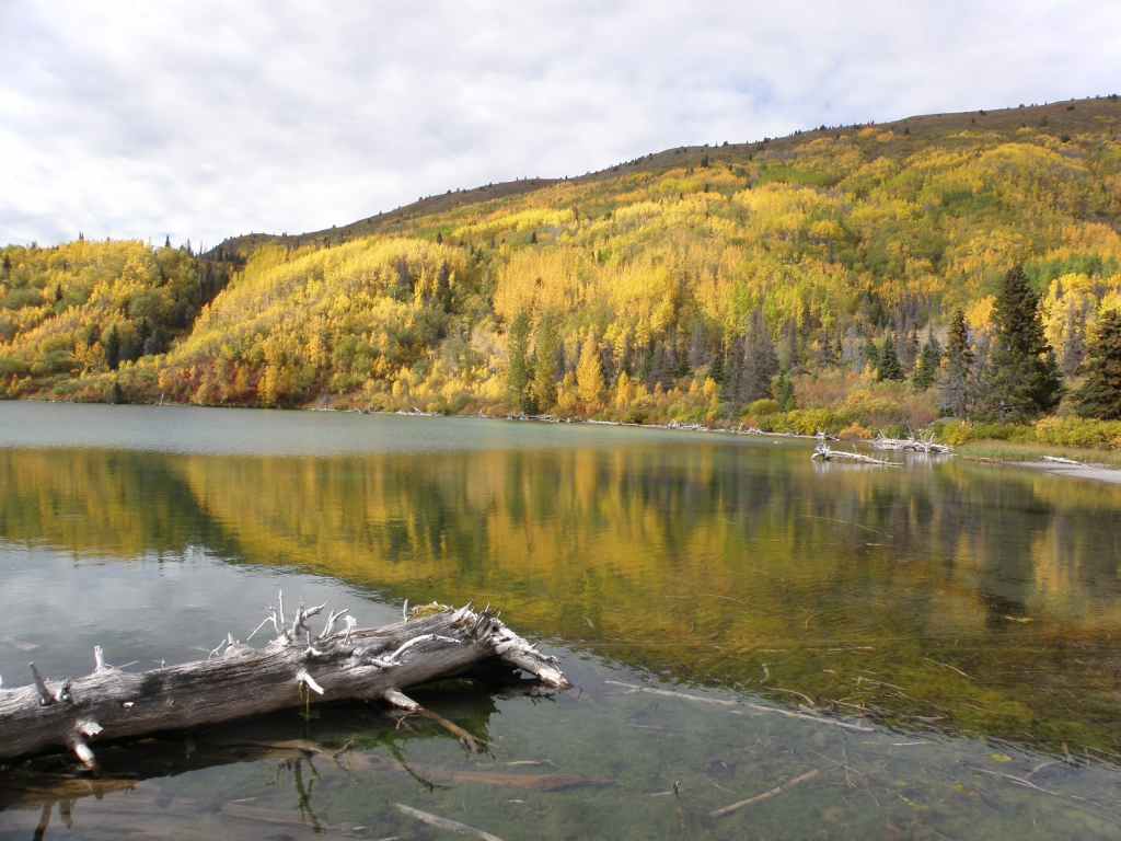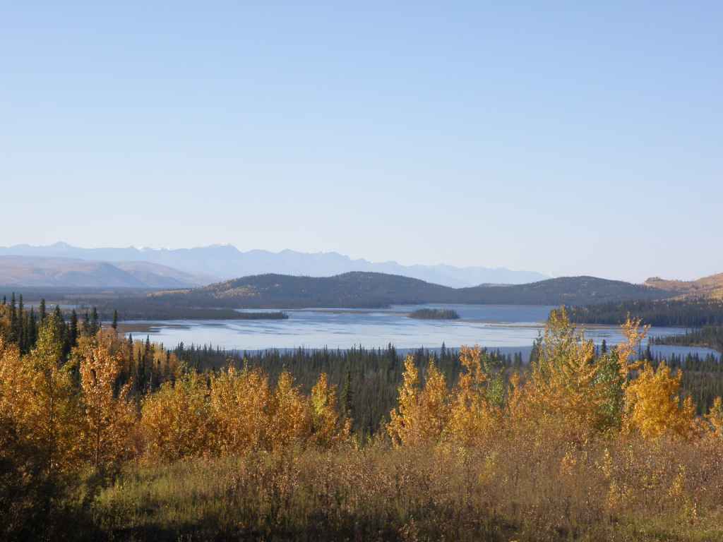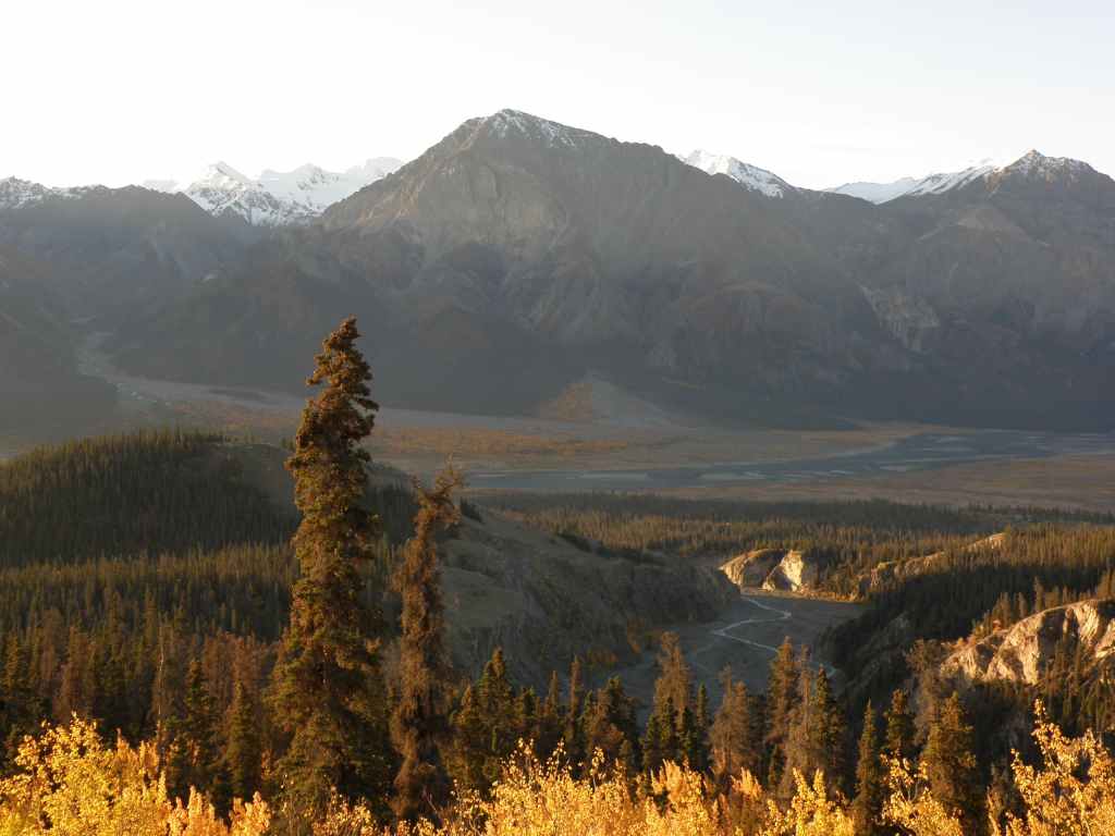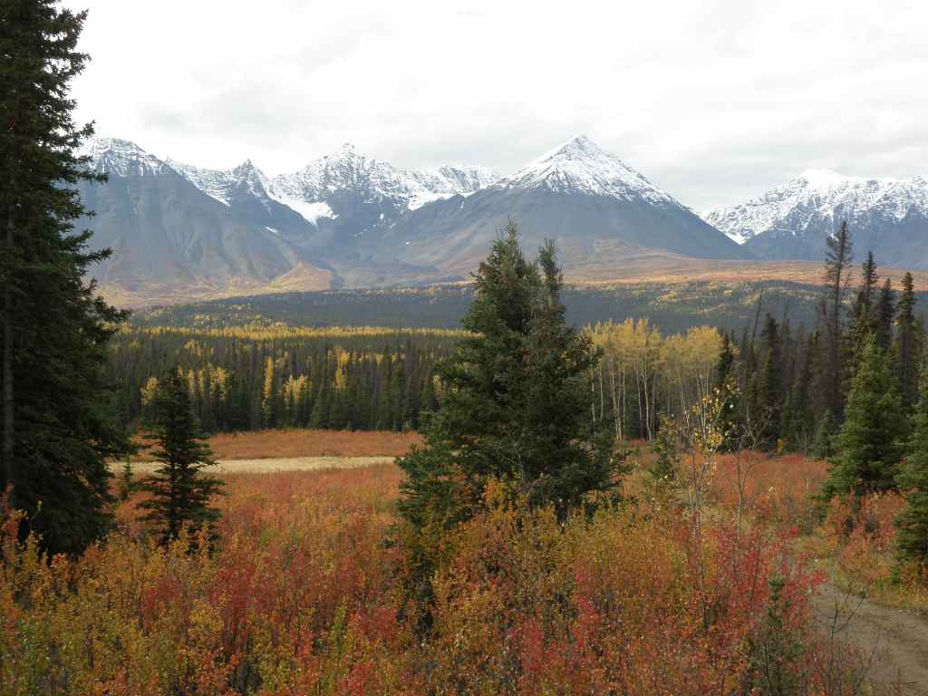 -5°C ce matin… grosse étape sur une Alaska Highway bien défoncée par la fonte du permafrost (sol gelé toute l’année). On passe à Beaver Creek (ruisseau du castor), petit village où il n’ya rien, à peine de quoi acheter une boîte de conserve ! Puis nous retraversons la frontière américaine avec les mêmes systèmes de sécurité que précédemment. Nous traversons des paysages de lacs, marécages jaunis par l’automne, sur fond de hautes montagnes… c’est, comme d’habitude, grandiose. Nous arrivons enfin à Tok en Alaska. Comme dans le Yukon, l’agglomération ne ressemble à rien : une grande artère, très large, avec quelques maisons et magasins… Nous visitons un Gift Shop (magasin de souvenirs) où nous pouvons acheter toutes sortes de fourrures, de la peau de castor à la peau de grizzly, en passant par le lynx et le loup… Comme nous voulons éviter au maximum les campings, nous trouvons une petite place vers un lac, un peu à l’écart de la route, dans un sanctuaire pour orignaux, alors nous espérons en voir…