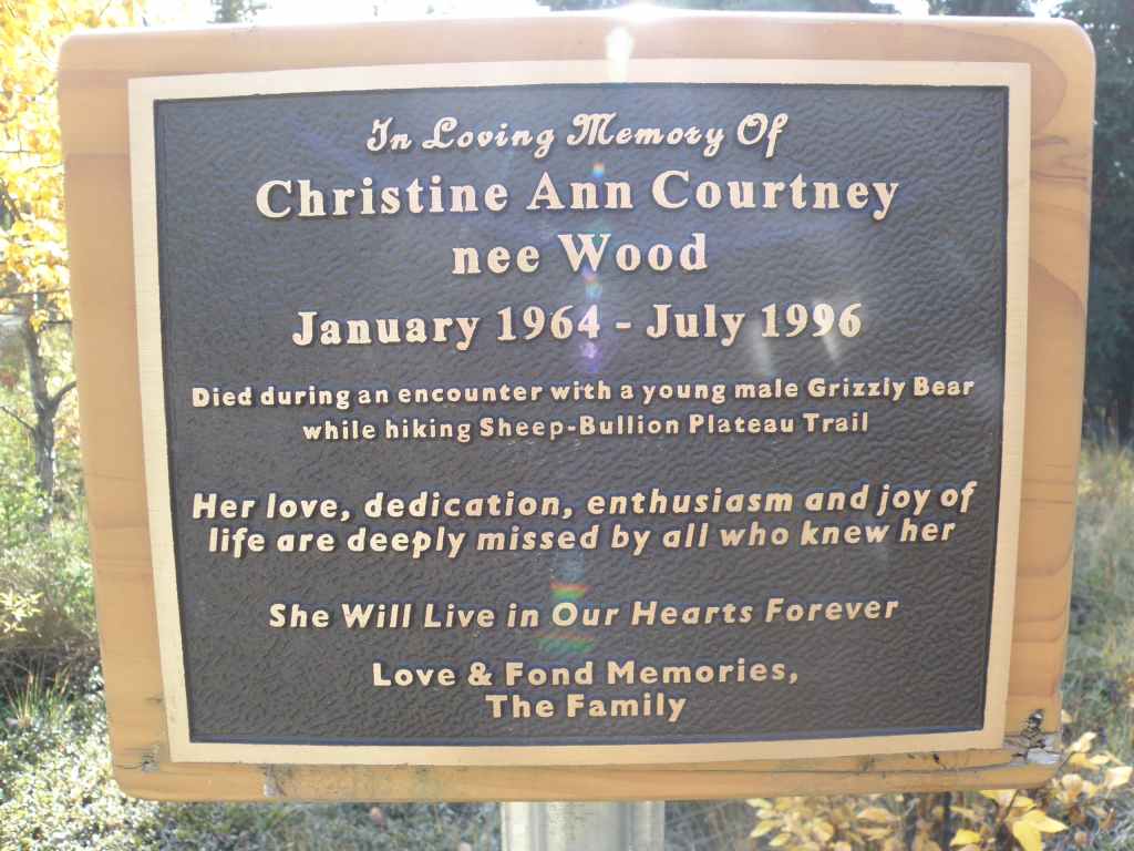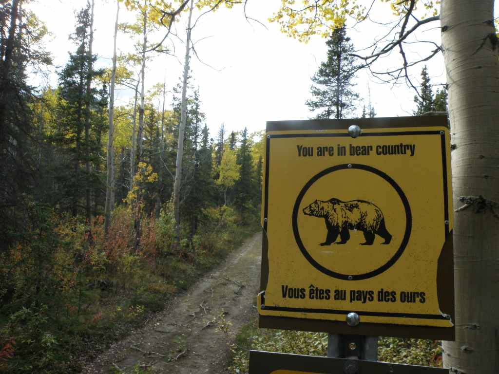 Départ à 8 heures sous un magnifique soleil mais avec -2°C. Nous voulons atteindre le mont Sheep (mouflon en anglais) à 1996 m d’altitude avec + 1300 m de dénivelé. Au départ du sentier, une jolie plaque nous signale qu’une dame s’est fait bouffée en 1996 par un jeune mâle grizzly !!! Sympathique… nous sommes donc sur nos gardes !
