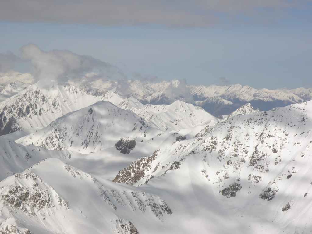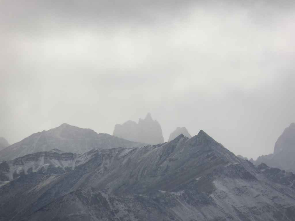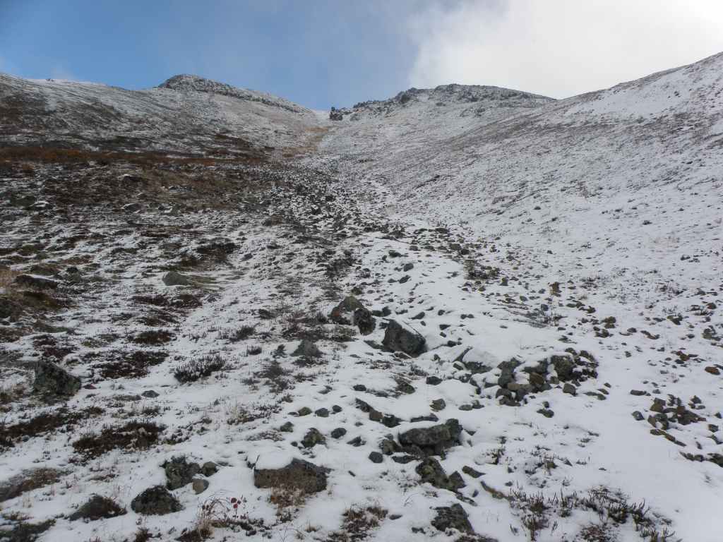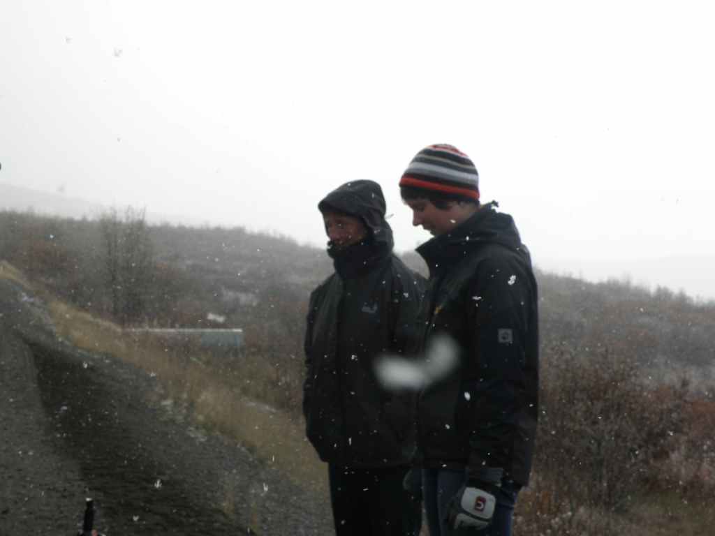 Après 1h30 d’efforts et de chaleureux remerciements, on rejoint un parking pour le repas. L’après-midi, je me lance seul dans l’ascension du sommet Goldensises toujours sous des averses de neige. Mais après une heure de montée dans un terrain peu stable et mal tracé, je perds la trace qui mène au sommet. Alors je redescends prudemment dans des schistes enneigés.