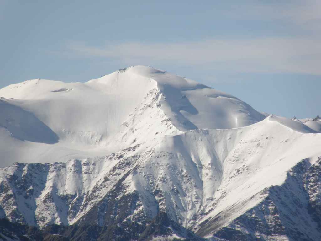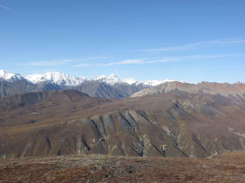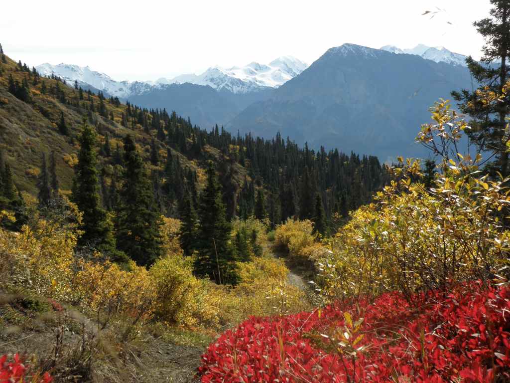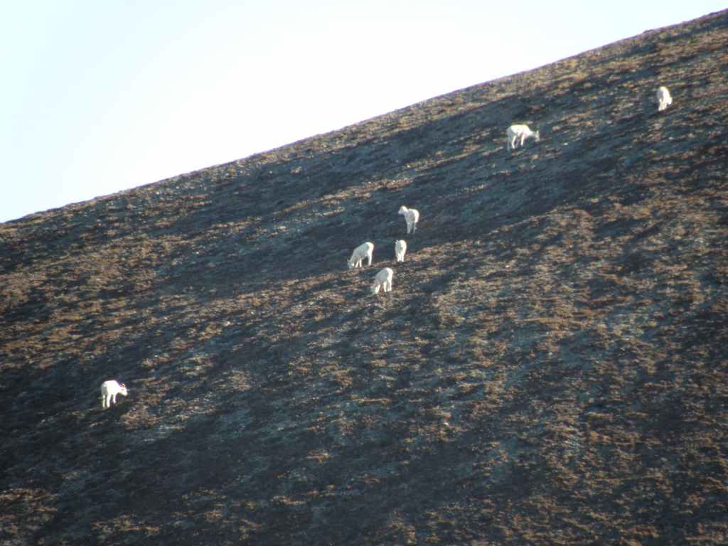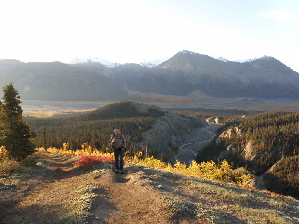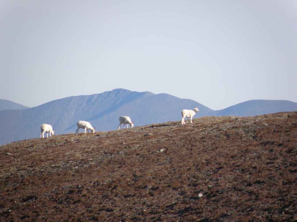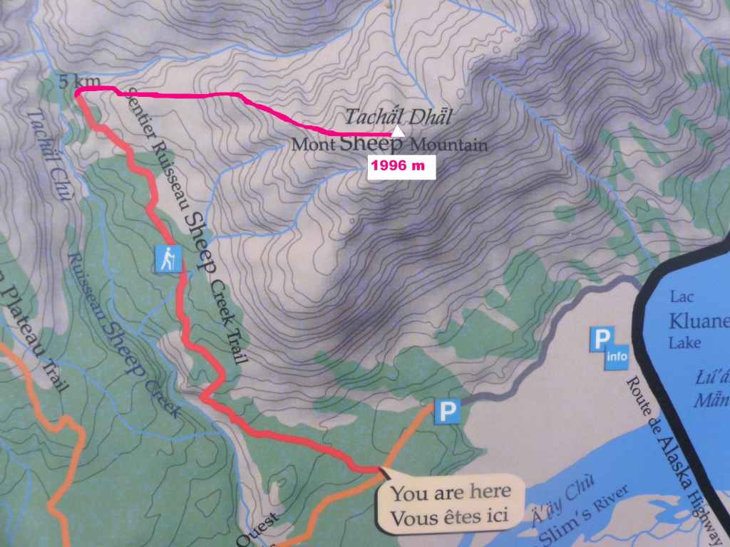 Nous arrivons au sommet pour manger en surplombant le lac Kluane et une harde de mouflons de Dall, tout de blanc vêtus… Puis descente par le même chemin ou presque puisqu’en voulant couper, nous nous retrouvons dans des buissons plus hauts que nous et très touffus… alors nous chantons à tue-tête pour signaler aux éventuels ursidés que des humains sont dans le secteur ! Mais rien, hormis une empreinte ancienne de cet animal sur le sentier. Nous croisons le chemin d’une femelle grand tetras et arrivés au parking, on tape la discute avec un jeune couple de québécois.