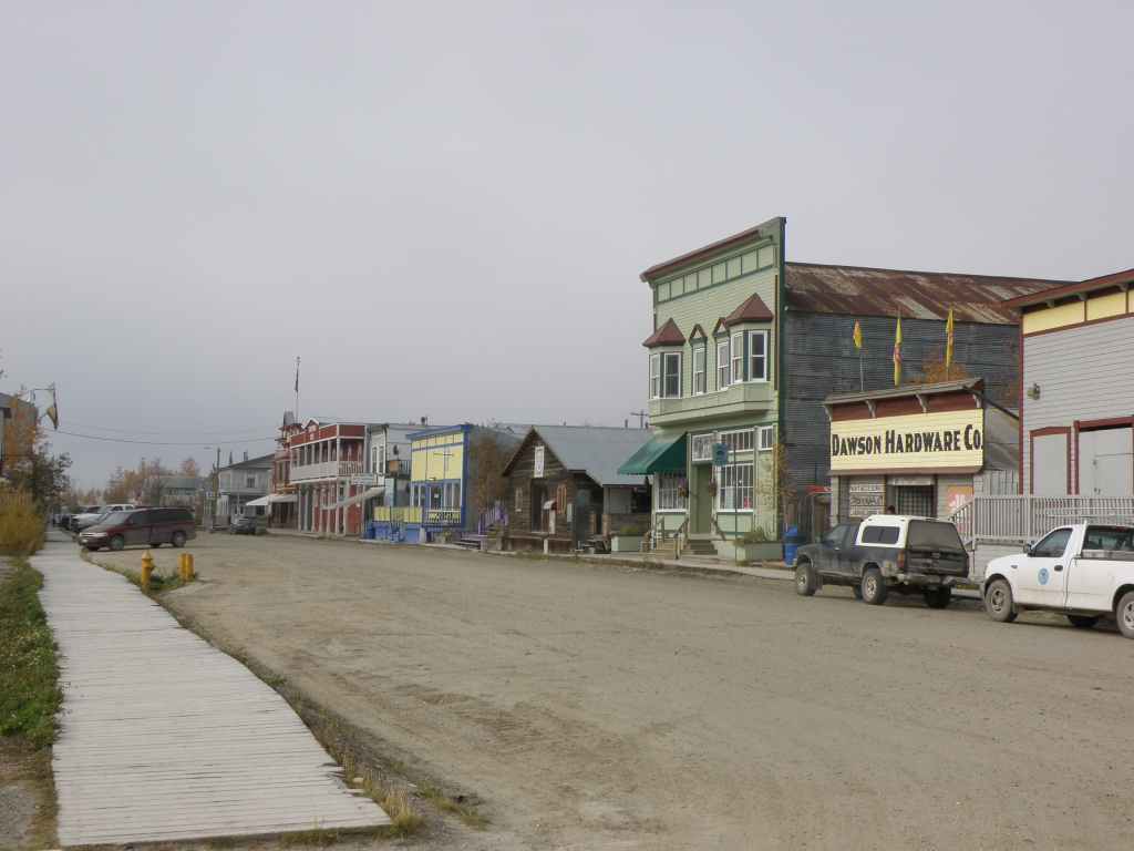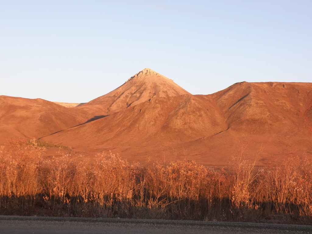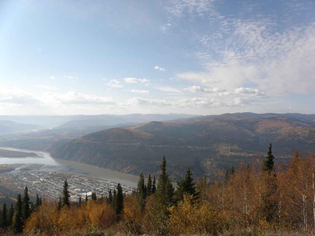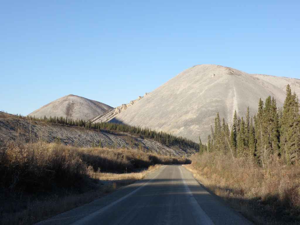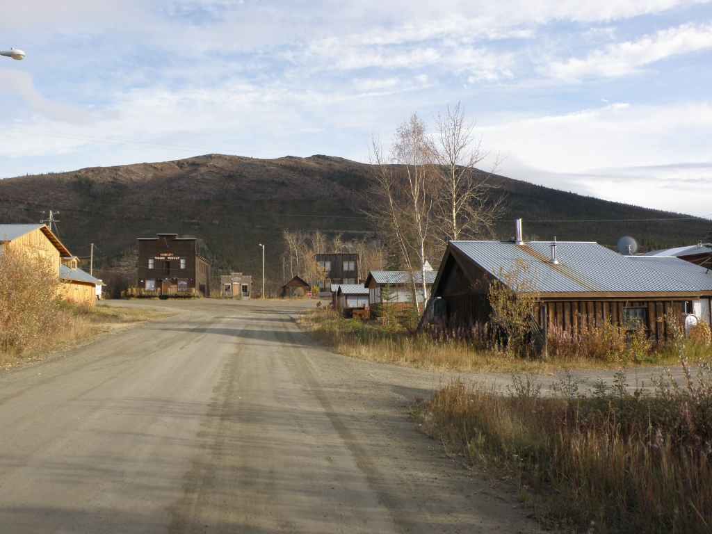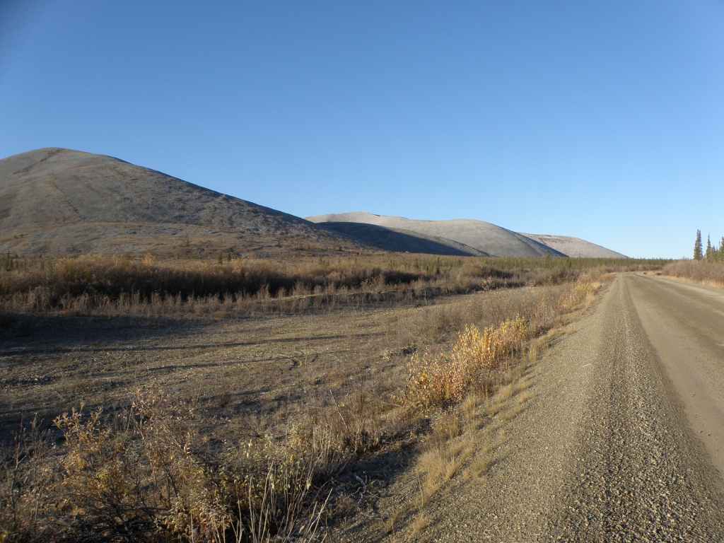 Pas de gel ce matin (1°C) mais toujours un soleil radieux. Après une visite de la ville en matinée (beaucoup plus authentique que Skagway) et quelques courses, nous partons voir la drague n°4. Celle-ci a détruit la vallée du ruisseau Bonanza afin de récupérer l’or qui s’y trouvait. La vallée offre un spectacle de désolation… Enfin, nous arrivons au croisement de la Dempster Highway.