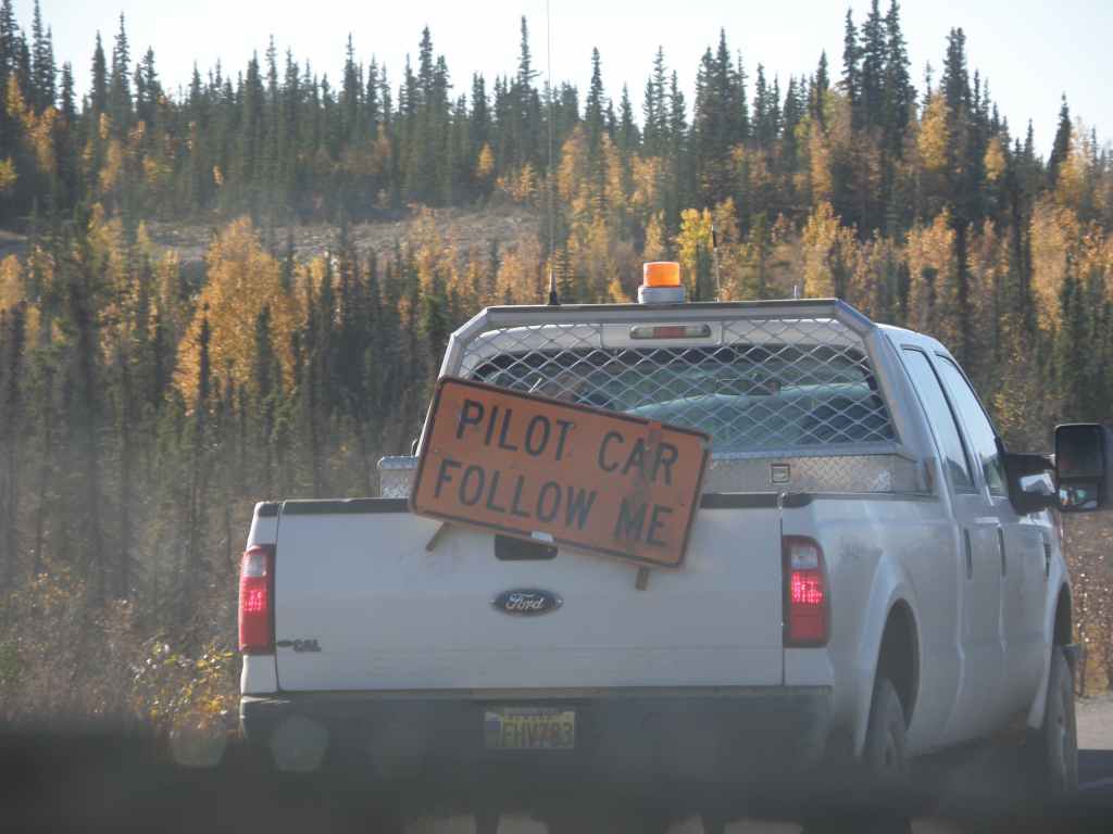 Plus loin de gros travaux de rénovation de la route (celle-ci a été emportée par des pluies diluviennes au printemps) nous obligent à attendre le véhicule pilote. Comme au Canada, dans les zones de travaux routiers, nous sommes escortés par une voiture pilote. Arrivés à la frontière canadienne, nous empruntons la « Top of the World Highway » (la route du sommet du monde). C’est une route de crête de 100 km qui ressemble à la route des crêtes des Vosges mais en beaucoup plus grand !