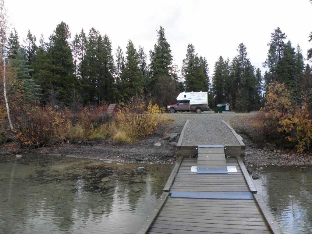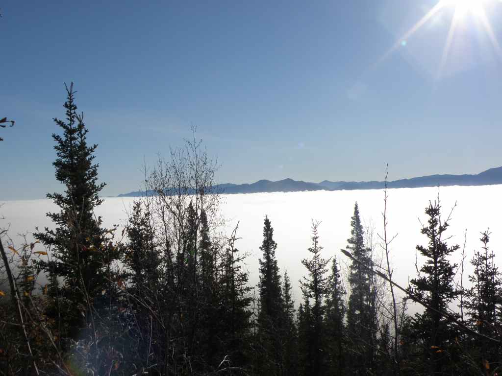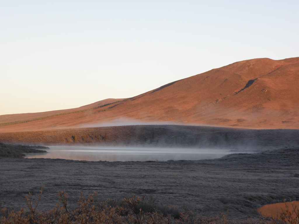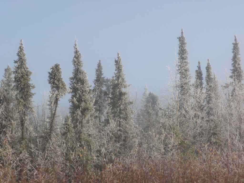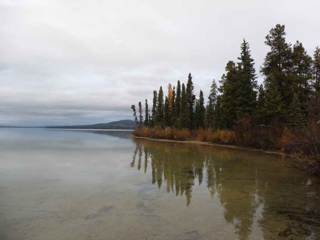 Nous sommes réveillés très tôt par le froid qui envahit la pièce… le chauffage s’est arrêté pendant la nuit. Les carreaux sont givrés à l’intérieur… le lac Chapman fume ! Il fait -7°C. Les couleurs au-dehors sont magnifiques. Aujourd’hui, une longue étape nous attend.