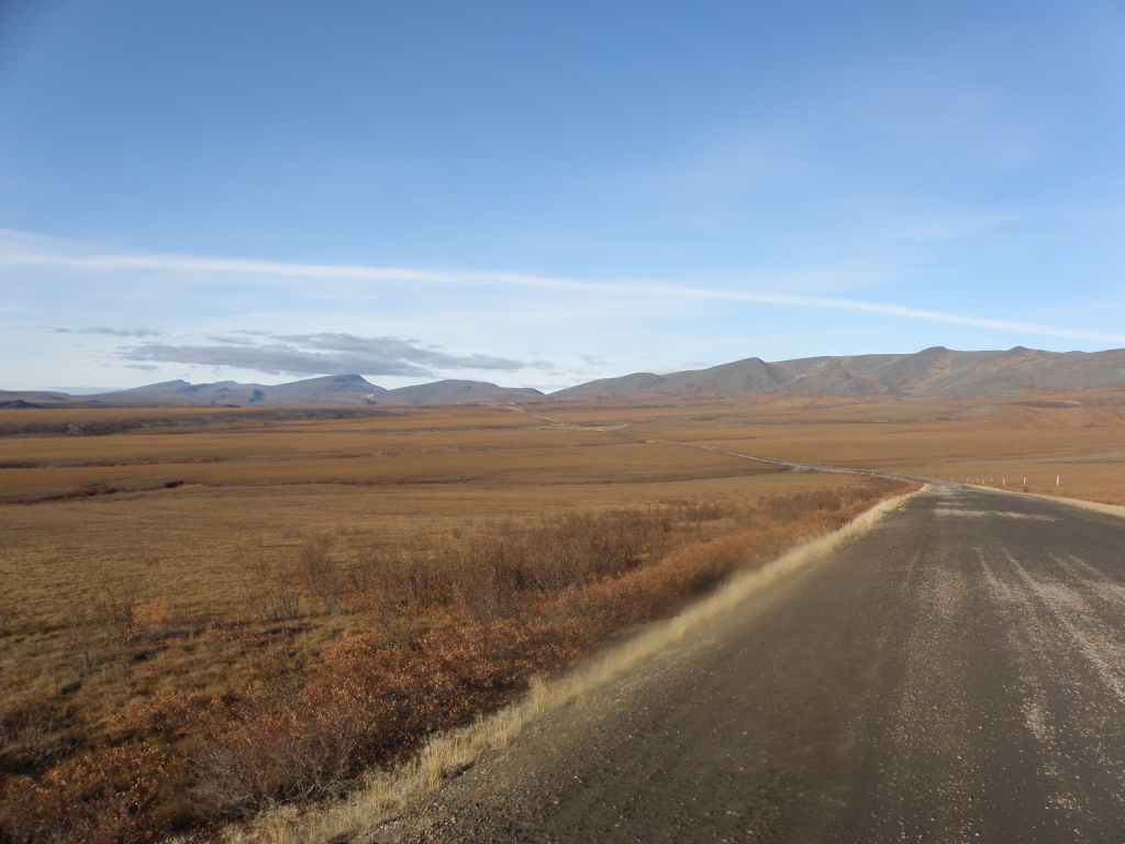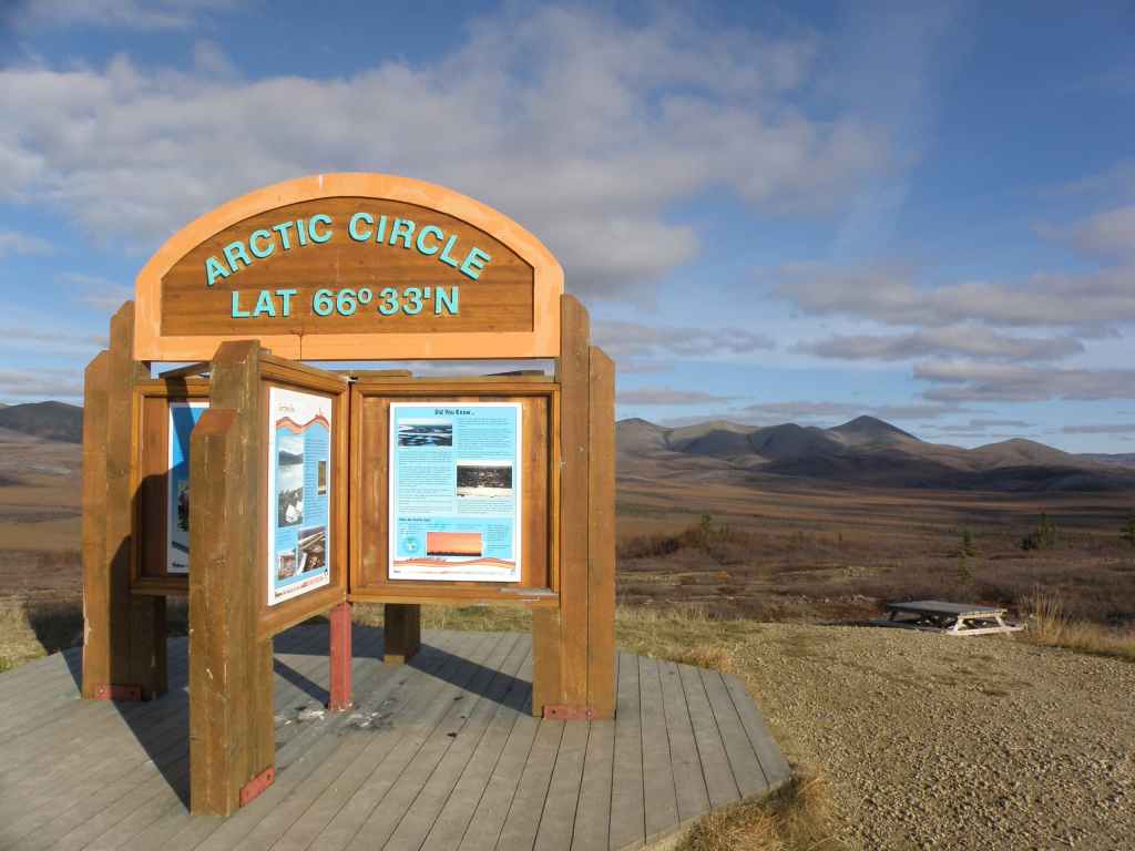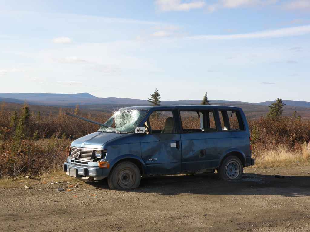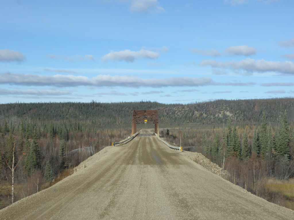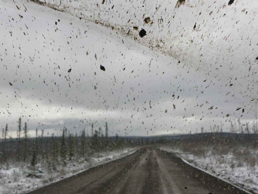 On traverse des paysages grandioses, d’une immensité exceptionnelle. Taïga puis toundra, crêtes, vallées, lacs puis une gorge : la piste est recouverte de boue et le camping-car va un peu dans tous les sens. J’enclenche donc les 4 roues motrices pour sortir plus facilement de ce passage. Plus tard, on passe le cercle arctique où l’on découvre un van mitraillé par des balles (!). On discute avec un amérindien en balade, qui nous dit qu’il a vu un grizzly à quelques kilomètres. On ouvre grand les yeux mais la seule trace de l’animal est une belle crotte posée sur la route.