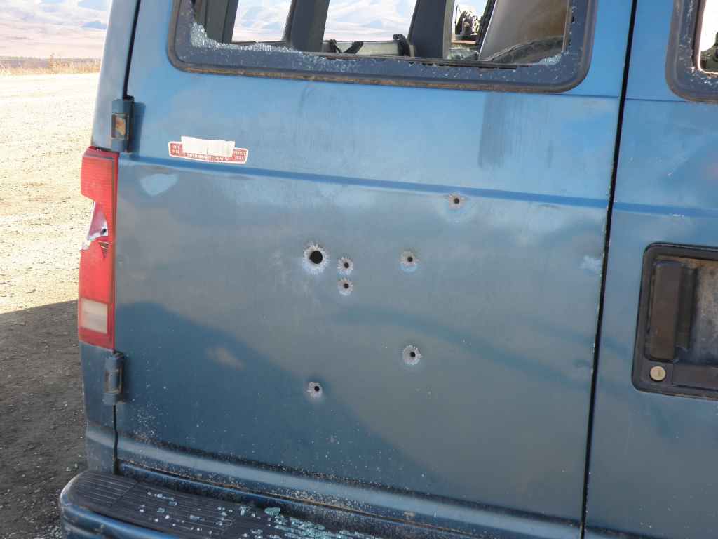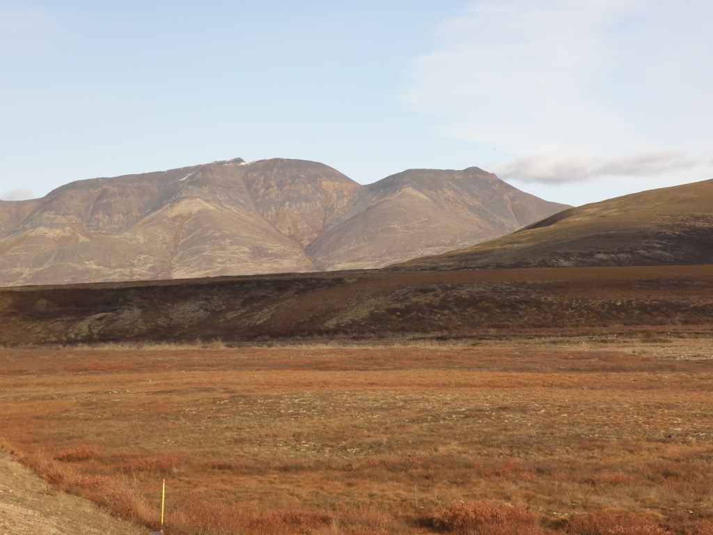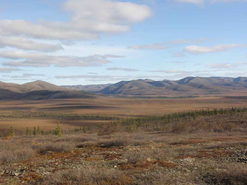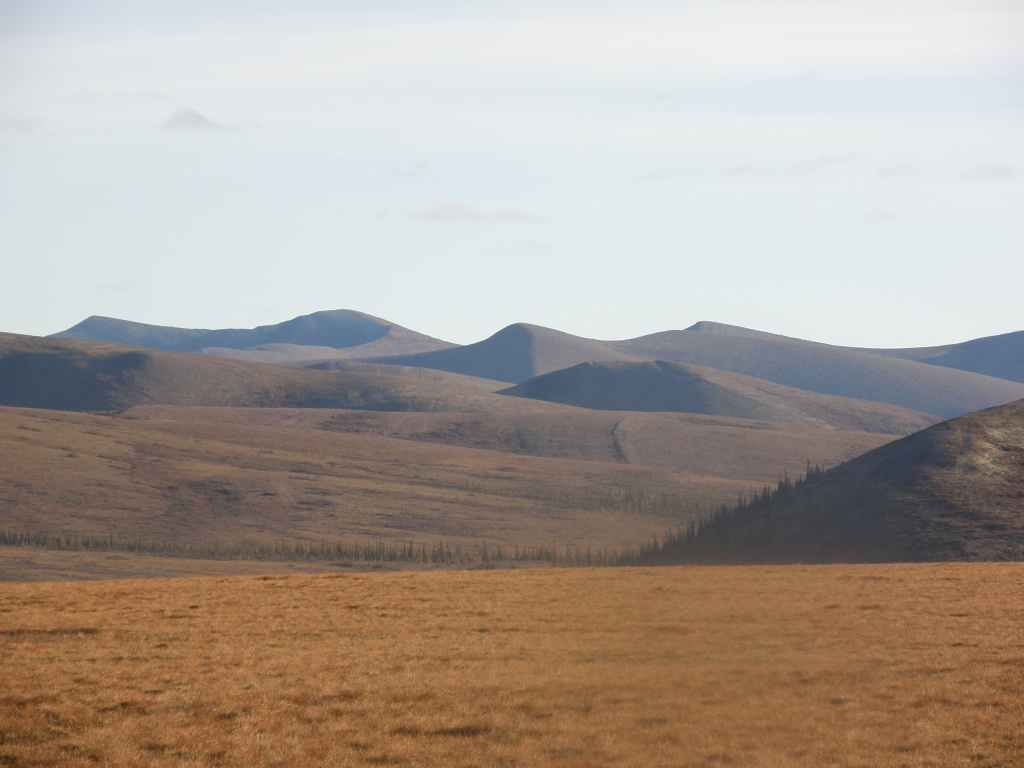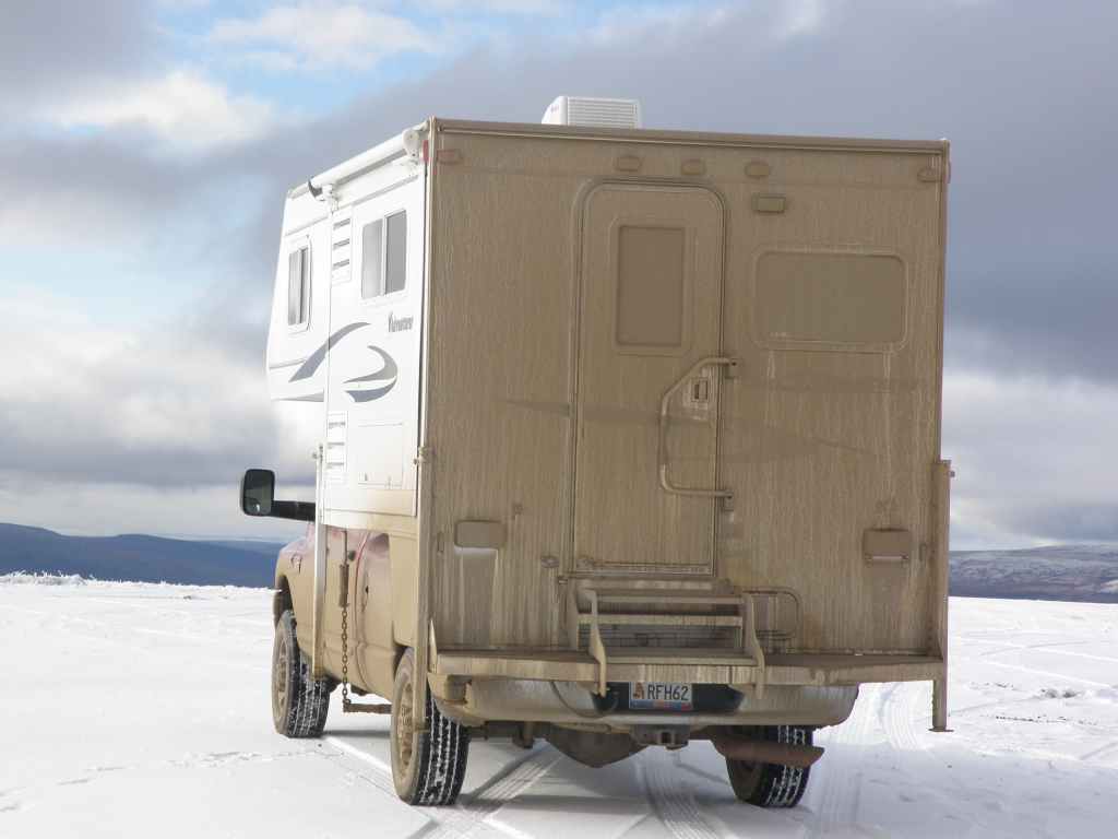 On traverse des paysages grandioses, d’une immensité exceptionnelle. Taïga puis toundra, crêtes, vallées, lacs puis une gorge : la piste est recouverte de boue et le camping-car va un peu dans tous les sens. J’enclenche donc les 4 roues motrices pour sortir plus facilement de ce passage. Plus tard, on passe le cercle arctique où l’on découvre un van mitraillé par des balles (!). On discute avec un amérindien en balade, qui nous dit qu’il a vu un grizzly à quelques kilomètres. On ouvre grand les yeux mais la seule trace de l’animal est une belle crotte posée sur la route.