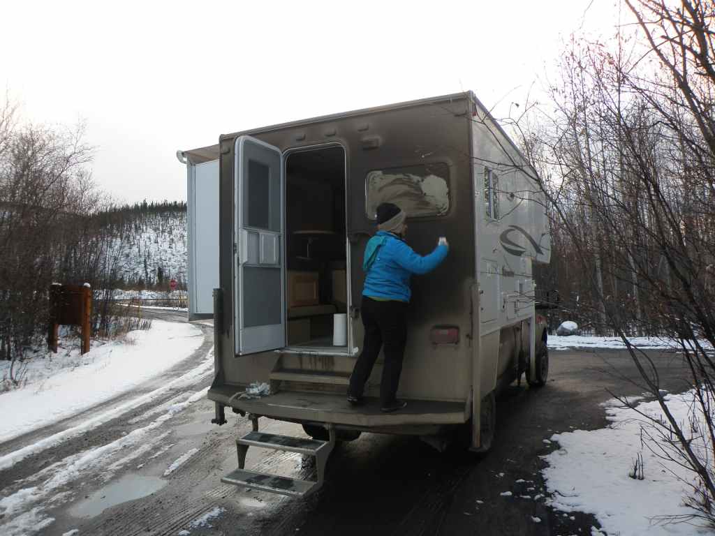 -7°C ce matin. C’est la matinée de tous les « dangers » avec le fort risque de panne de gas-oil. Nous avons 73 km à faire avant la prochaine station et le voyant s’est allumé rapidement. A 80 km/h, on consomme 17 à 18 l/100 alors je roule à 60 pour essayer d’atteindre Ross River sans encombre… on stresse pas mal.
