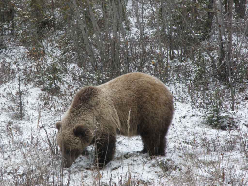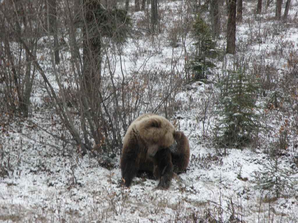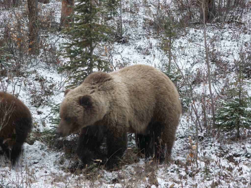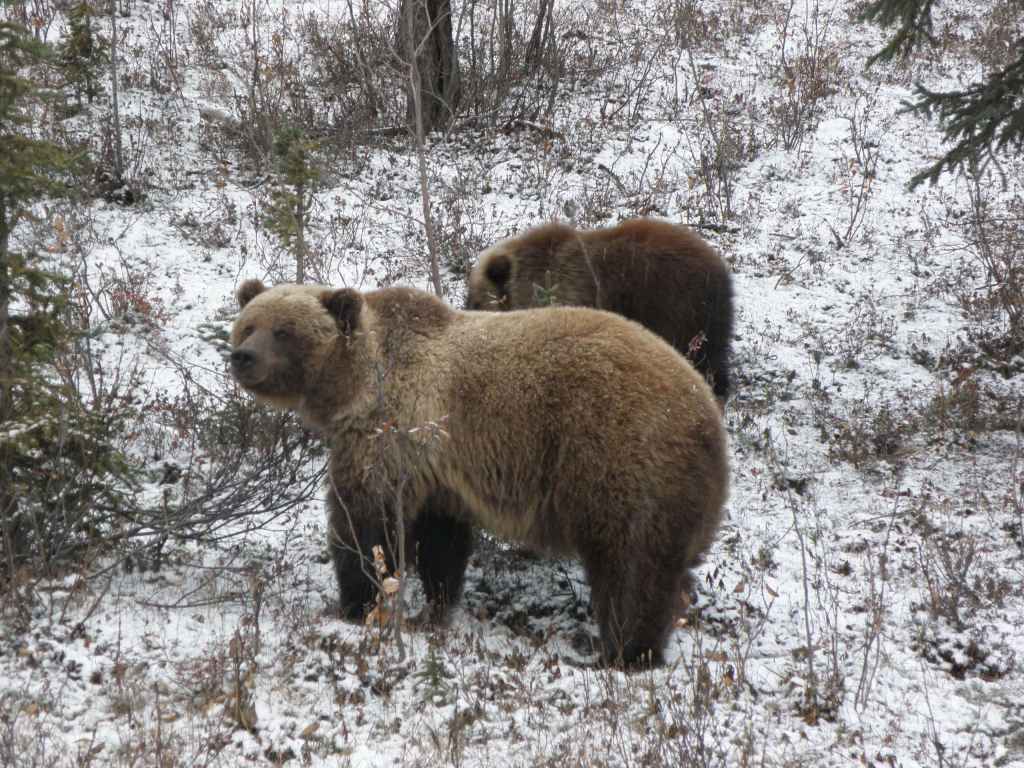 Il fait ce matin -5°C. La piste est plus ou moins enneigée et à peine 15 mn après le départ, j’aperçois à la lisière de la forêt 2 ours, 2 grizzlys, la mère et son petit déjà grand tout de même… c’est magnifique ! On s’arrête à leur niveau. Ils ne paraissent pas effarouchés ni agressifs mais on reste dans la voiture pour les mitrailler de photos ! Après 10mn, on les laisse tranquille pour qu’ils puissent continuer à chercher leur nourriture sous la neige.