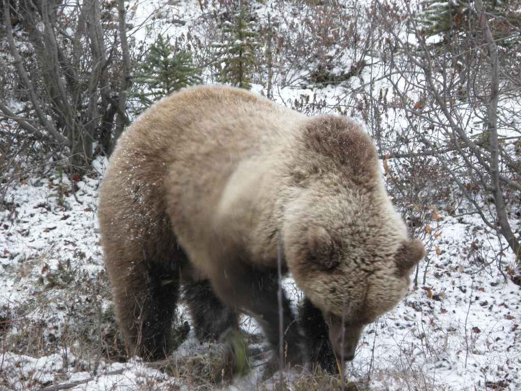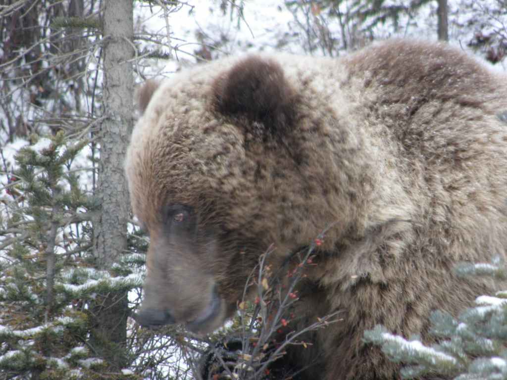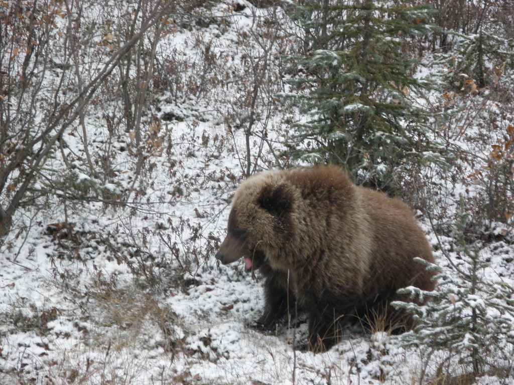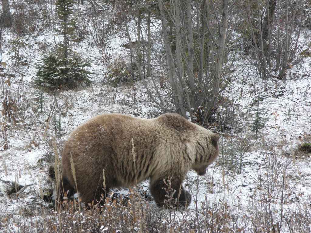 Il fait ce matin -5°C. La piste est plus ou moins enneigée et à peine 15 mn après le départ, j’aperçois à la lisière de la forêt 2 ours, 2 grizzlys, la mère et son petit déjà grand tout de même… c’est magnifique ! On s’arrête à leur niveau. Ils ne paraissent pas effarouchés ni agressifs mais on reste dans la voiture pour les mitrailler de photos ! Après 10mn, on les laisse tranquille pour qu’ils puissent continuer à chercher leur nourriture sous la neige.