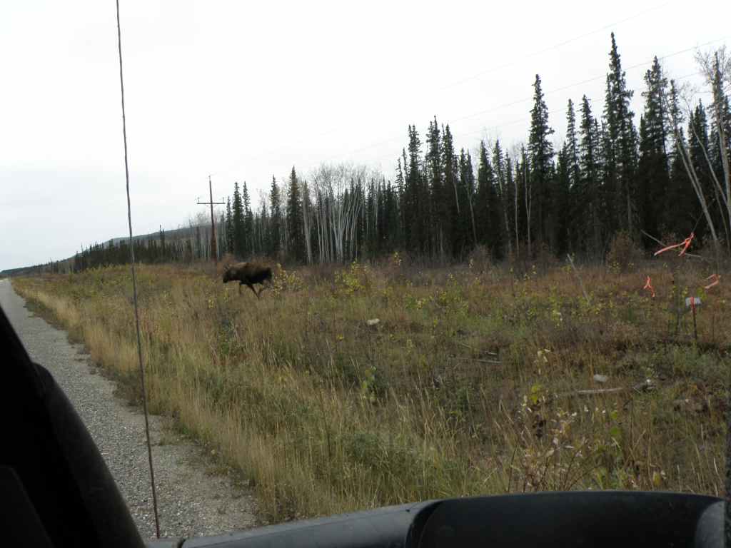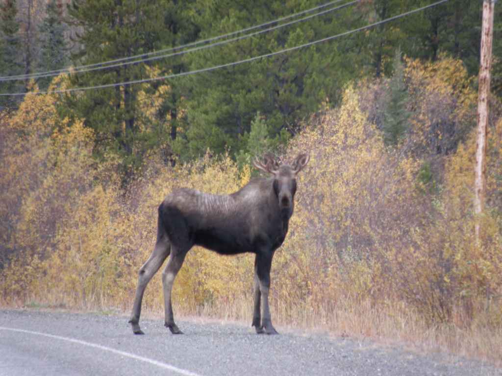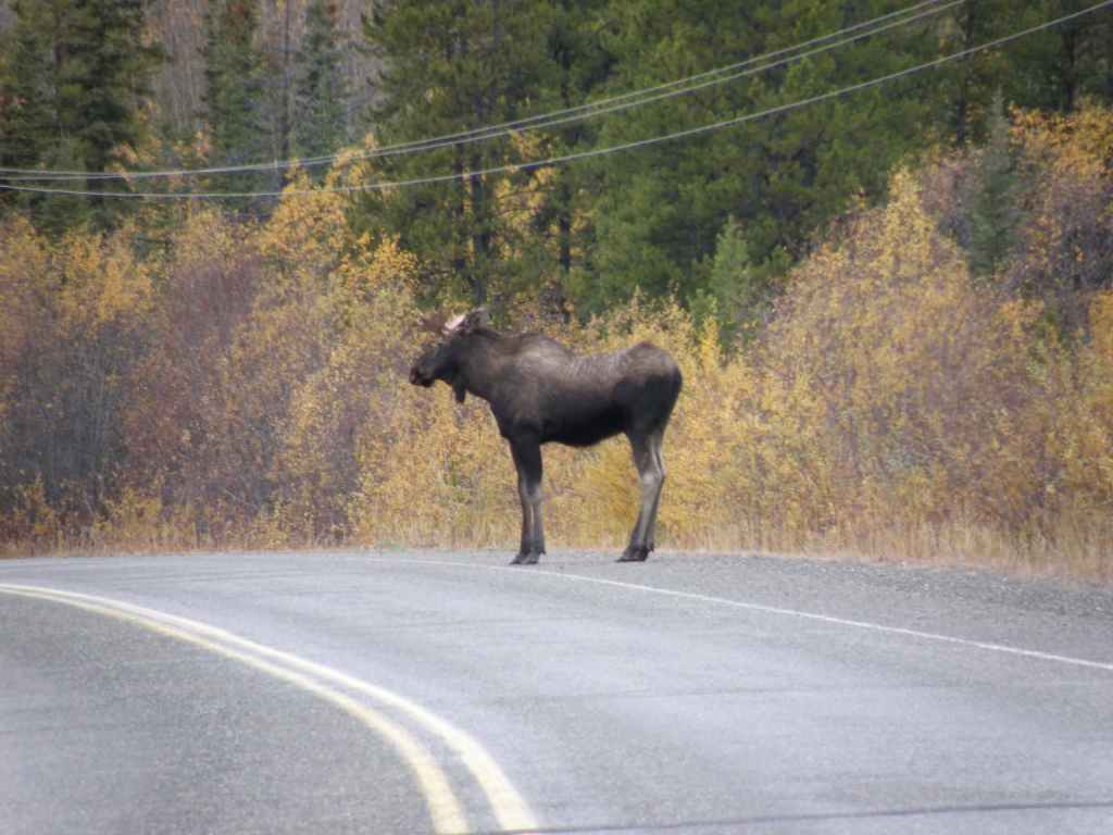 C’est notre dernier jour de route. Nous avons retrouvé des températures et des couleurs d’automne. Théoriquement plus de surprise jusqu’à notre arrivée à Whitehorse sauf un jeune orignal mâle qui stationne en bord de route. J’ai le temps de m’arrêter et de le photographier : splendide !
