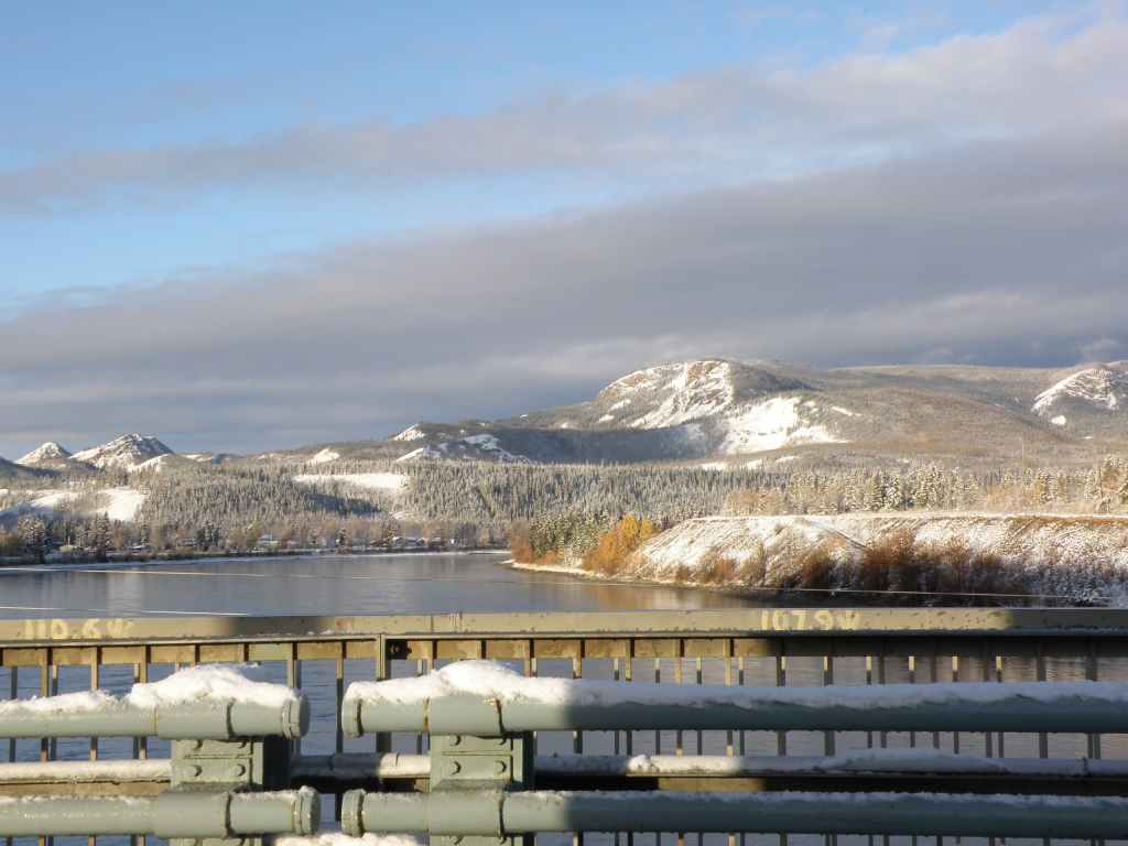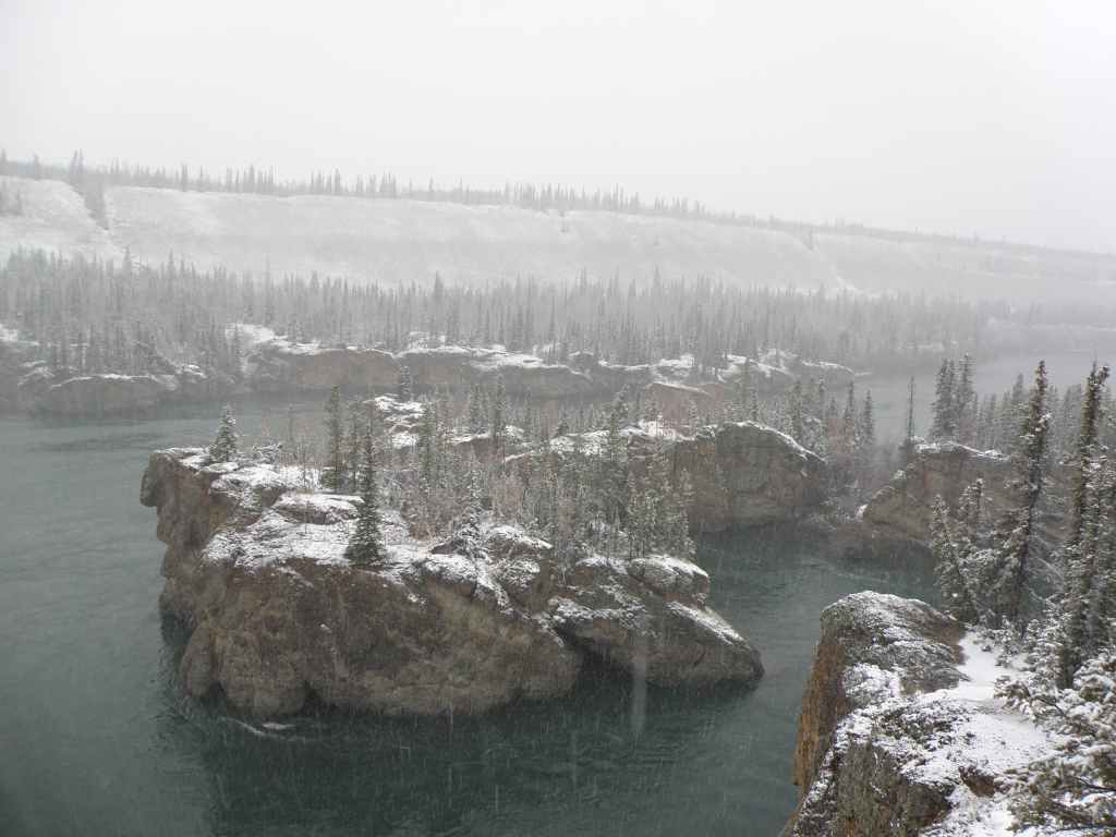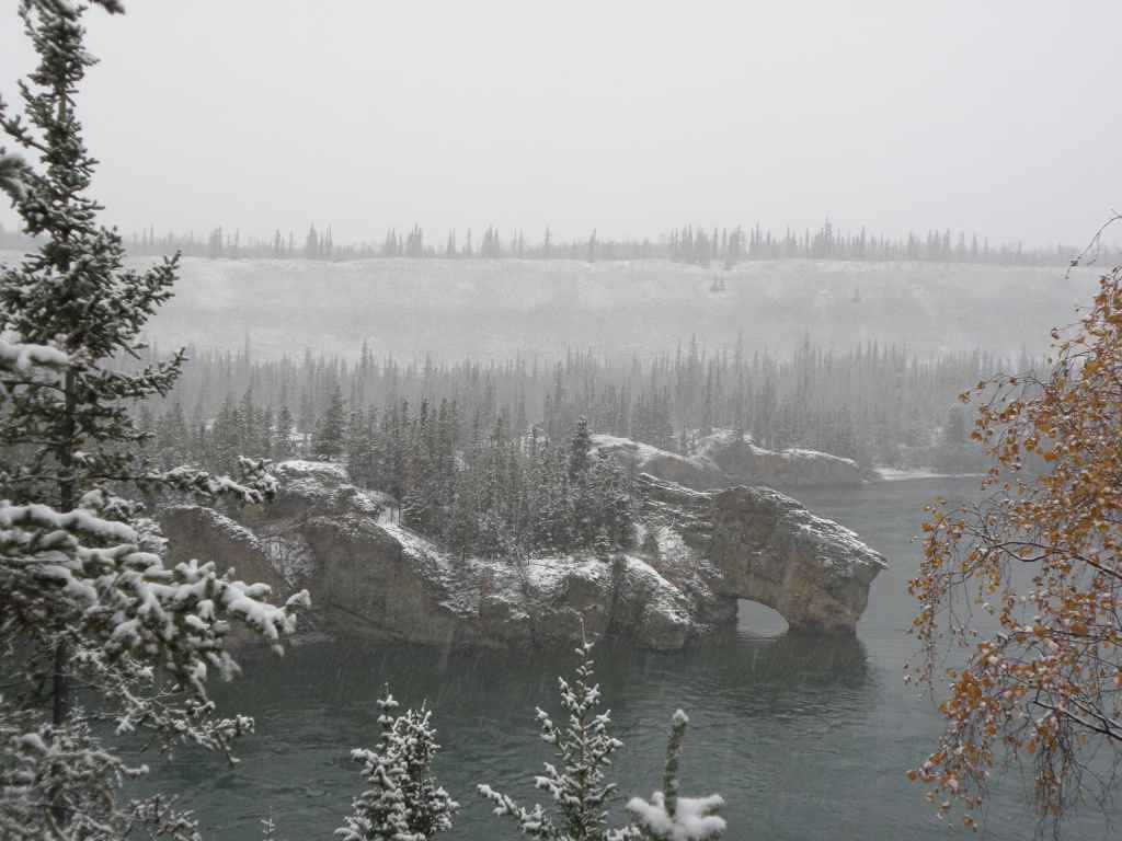 Nous passons à Stewart Crossing puis Pelly Crossing avant de longer à nouveau le fleuve Yukon. Il neige bien et la route se recouvre d’une pellicule de neige. Nous nous arrêtons aux rapides de Five Fingers (cinq doigts) comme les 5 rochers plantés au milieu du fleuve. Petite balade dans la neige.
