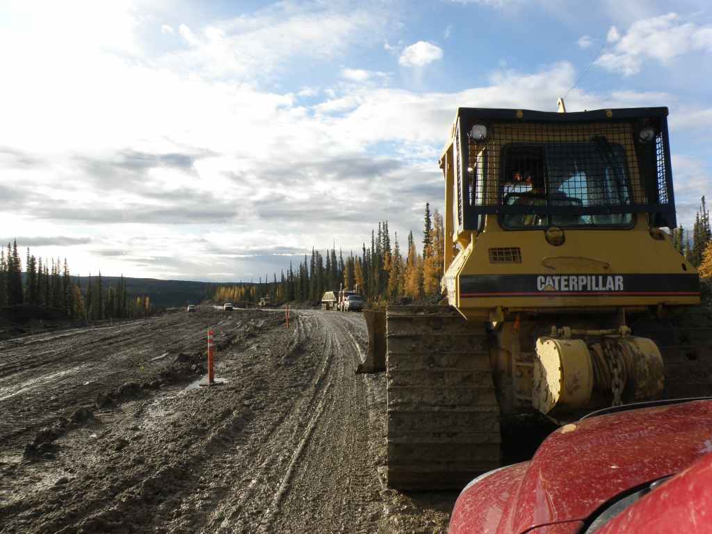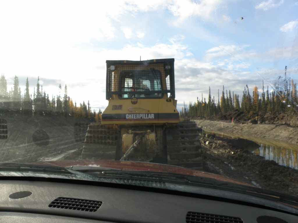 Nous ne sommes plus qu’à 80 km de Watson Lake et des routes goudronnées, mais nous ne sommes pas au bout de nos peines. En effet, après quelques kilomètres de piste, des travaux gigantesques de réfection de la route sont en cours. La piste se transforme en un champ de labour. J’enclenche donc les 4 roues motrices et me lance… pas longtemps ! La voiture se pose sur la boue et s’embourbe. J’arrive tout de même à reculer. Au loin, un employé a vu la manœuvre et arrive avec son Caterpillar à chenilles. Il se place devant moi et me dit avec un grand sourire qu’il va nous faire traverser la zone. Il nous attache donc avec une chaîne et nous tracte jusqu’à ce que le terrain soit plus dur. Ça balance à gauche, à droite mais ça passe… après nos remerciements on repart sur piste plus dure mais toujours très boueuse.